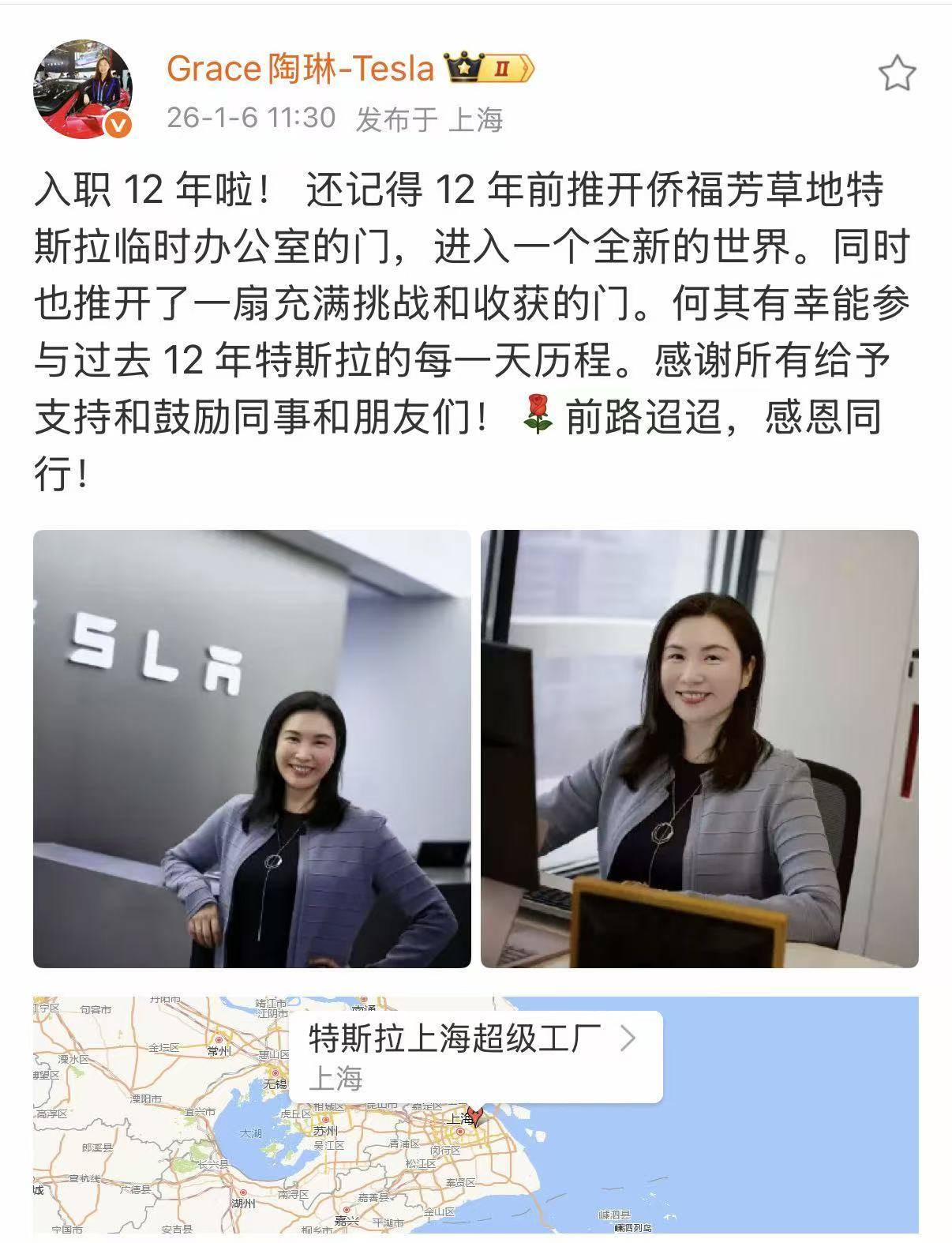 陶琳入职特斯拉12年发文感恩