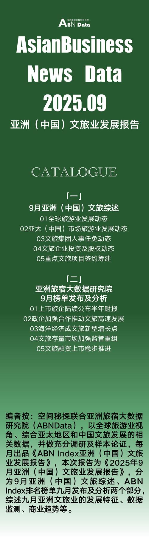9月亚洲(中国)文旅综述 本文来自微信公众号"空间秘探",作者:ABNData,36氪经授权发布。 01 全球旅游业发展动态 9月10日,联合国世界旅游组织发布的《世界旅游业晴雨表》显示,2025年上半年全球国际游客到访量同比增长5%。数 据显示,今年上半年全球共有约6.9亿人次出境旅行,比去年同期增加约3300万人次。亚太地区整体增长11%。 美国方面, 根据亚洲旅宿大数据研究院监测数据,美国服务业9月陷入停滞,商业活动生产指数自2020年5月以来首次跌 入萎缩区间.新订单大幅下滑,就业连续4个月收缩,凸显川普关税政策与政策不确定性对经济最大部门的冲击。在产业别 方面,9月共有10个服务业分项呈现成长,由住宿餐饮服务业,医疗保健领涨;7个产业则陷入萎缩,包括矿业,营建与零售 业。美国福克斯新闻网报道称,美国旅游业正面临数十年来最严峻的挑战,因为加拿大、英国、中国、德国、巴西、墨 西哥等世界重要客源市场的旅行者纷纷放弃了赴美计划。造成目前现状的主要原因是特朗普政府对于入境人员的严格审 查、不稳定的政治和经济环境、签证政策以及持续提升的签证费用等。美国将于10月1日起生效的"签证诚信费"政策,使 得大多数国家和 ...