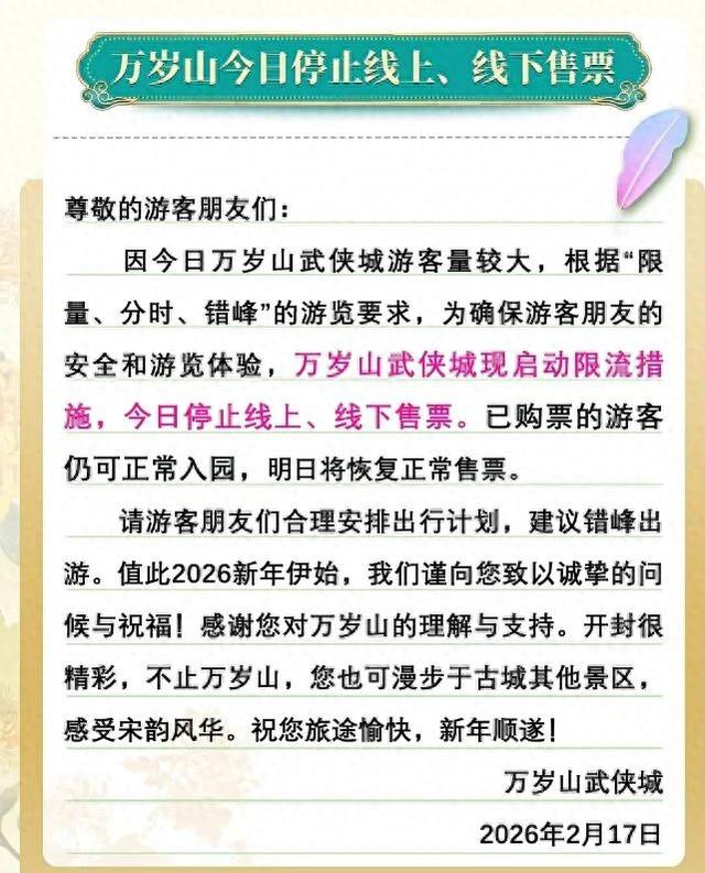 2月17日,河南龙门石窟、白马寺、万岁山武侠城等景区发布门票预约已满或限流,停止售票提示。春 节假期有出游计划的朋友请提前关注景区相关信息。 万岁山武侠城 因今日万岁山武侠城游客量较大,根据限量、分时、错峰的游览要求,为确保游客朋友的安全和游览体 验,万岁山武侠城现启动限流措施,今日停止线上、线下售票。已购票的游客仍可正常入园,明日将恢 复正常售票。 洛阳白马寺 2026年2月17日-2月22日(正月初一至初六)全天所有时段洛阳白马寺景区门票预约已满。已预约的游客请 按照预约时间凭身份证及优惠证件有序进寺。尚未预约的游客可调整其他时间段或择日预约参观。 龙门石窟 春节假期期间龙门石窟实行线上门票预约和线下应急购票相结合游览制。2月19日(大年初三)线上门票 预约已满,线下还有部分余票。已预约的游客请按照预约时段有序入园。2月17日、2月18日、2月20 日、2月21日、2月22日、2月23日还有余票。 洛阳博物馆 洛阳博物馆大年初一、大年初二、大年初三(2月17日、2月18日、2月19日)门票预约已满,已预约的游 客请按照预约时段有序进馆。尚未预约门票的游客可调整其他行程或择日预约参观。 丹江大观苑 2月17 ...