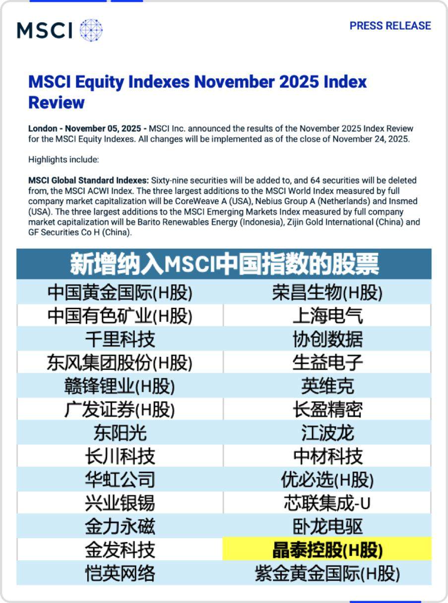 北京时间11月6日早间,全球知名指数公司MSCI宣布了2025年11月份指数审核结果。以人工智能(AI)和机器人驱动新药与新材料 创新的晶泰科技(02228)获选纳入MSCI最受关注的旗舰指数——MSCI中国指数。此项调整依据其11月份半年度指数审议结果, 并将于2025年11月24日收盘后正式生效。 MSCI中国指数是衡量中国大型及中型公司股票表现的关键基准之一,受到全球机构投资者的广泛追踪和参考。其指数成份股的 筛选基于客观量化指标,包括公司市值、自由流通量、流动性和市场可投资性等。入选该指数表明晶泰科技在市值规模、市场 代表性以及流动性等方面达到严格的国际标准,公司的投资价值与增长潜力获得了全球资本市场的权威认可。 打造稀缺技术平台,聚焦垂直领域AI产业化落地 | 新增纳入MSCI中国指数的股票 | | | --- | --- | | 中国黄金国际(H股) | 荣昌生物(H股) | | 中国有色矿业(H股) | 上海电气 | | 干草科技 | 协创数据 | | 东风集团股份(H股) | 生益电子 | | 赣锋锂业(H股) | 英维克 | | 广发证券(H股) | 长盈精密 | | 东阳光 | 江波龙 | ...