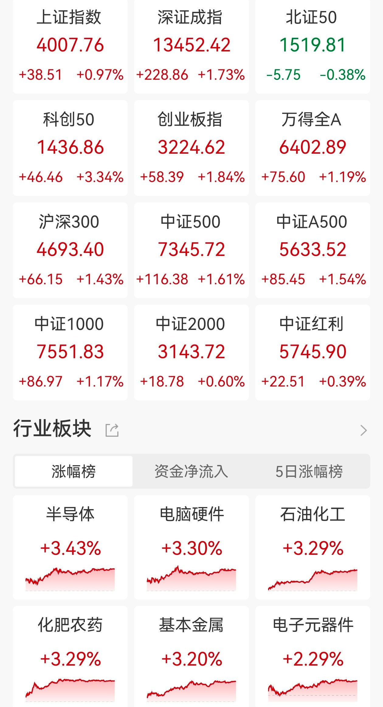 A股三大指数今日集体上涨,沪指重回4000点;截至收盘,沪指涨0.97%报4004点,深证成指涨1.73%, 创业板指涨1.84%,科创50指数涨3.34%。全市场成交额2.08万亿元,较前一交易日增量1816亿元,近 2900股上涨。 盘面上,化肥、磷化工板块走高,云天化、芭田股份等多股涨停;近七成有色股前三季 度净利增长,有色金属板块爆发,中国铝业、南山铝业等多股涨停;小鹏人形机器人IRON亮相,机器 人板块活跃,汉宇集团一度触及涨停;CPO概念拉升,可川科技涨停;半导体、存储芯片、电源设备及 激光雷达等板块涨幅居前。另外,近期连续大涨的海南板块回调,海汽集团跌停;船舶制造板块走低, 江龙船艇领跌;旅游酒店板块走弱,大连圣亚跌停;影视概念、免税概念及短剧概念等跌幅居前。(格 隆汇) | 上证指数 | 深证成指 | 北证50 | | --- | --- | --- | | 4007.76 13452.42 1519.81 | | | | +38.51 +0.97% +228.86 +1.73% -5.75 -0.38% | | | | 科创50 | 创业板指 | 万得全A | | 1436.86 | 322 ...
