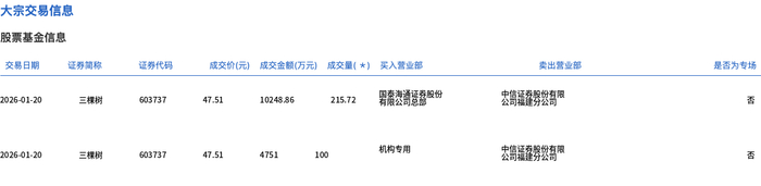 | 交易日期 | 证券調称 | 证券代码 | 成交价(元) 成交金额(万元) 成交量(*) 买入营业部 | | | | 类出管业部 | 是否为专场 | | | --- | --- | --- | --- | --- | --- | --- | --- | --- | --- | | 2026-01-20 | 三棵树 | 603737 | 47.51 10248.86 | 215.72 | 用意患者适量假份 | 去筒量盆男公部■ | | | KE | | 2026-01-20 | 三棵树 | 603737 | 47.51 4751 | 100 | 机构专用 | 去筒墙露劈纹筒气 | | | Ka | 1月20日,三棵树大宗交易成交315.72万股,成交额1.5亿元,占当日总成交额的18.23%,成交价47.51 元,较市场收盘价48.38元折价1.8%。 ...