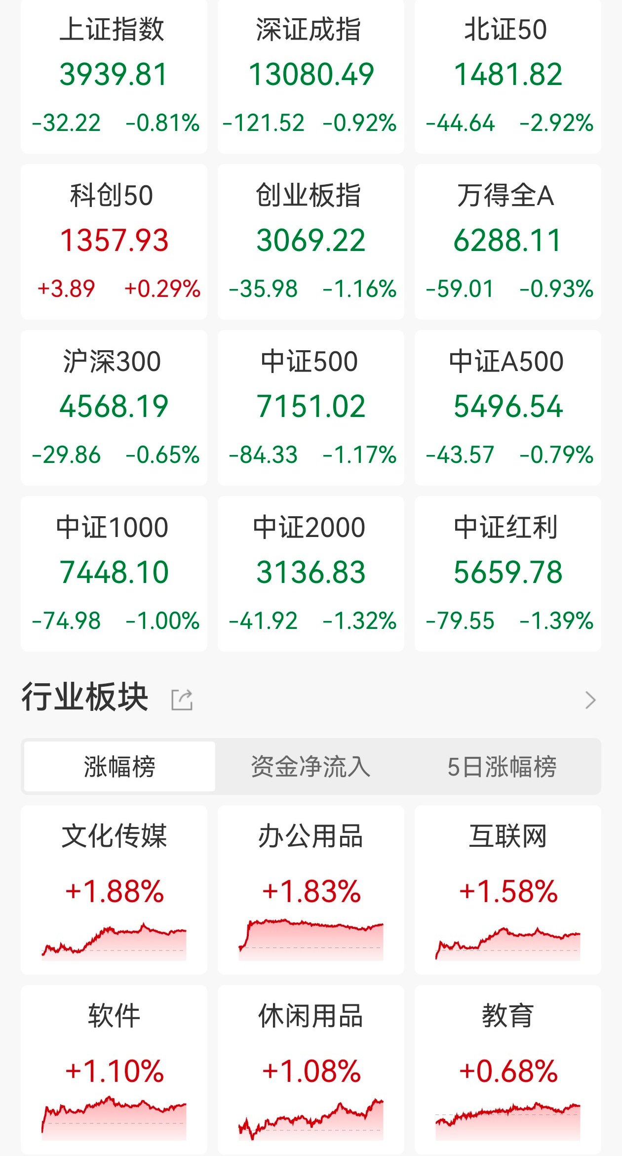 A股三大指数今日集体下跌,均录得日线三连跌;截至收盘,沪指跌0.81%报3939点,深证成指跌0.92%,创业板指跌1.16%,北证50指数跌2.92%。全市场 成交额1.95万亿元,较前一交易日增量156亿元,逾4100股下跌。 | 涨幅榜 | 资金净流入 | 5日涨幅を | | --- | --- | --- | | 文化传媒 | 办公用品 | 互联网 | | +1.88% | +1.83% | +1.589 | | 软件 | 休闲用品 | 教育 | | +1.10% | +1.08% | +0.689 | 盘面上,煤炭板块下挫,云煤能源跌停;固态电池、麒麟电池板块走低,天际股份、璞泰来等多股跌停;氟化工板块回调,多氟多、天赐材料等多股跌停; 有机硅、钛白粉及钢铁等板块跌幅居前。另外,拼多多概念走高,光云科技20CM涨停;AI应用集体走高,Sora概念、Kimi概念及AI预料等涨幅居前,宣亚 国际、福石控股及视觉中国等多股涨停;文化传媒、小红书概念、盲盒经济及互联网服务等板块涨幅居前。(格隆汇) | 上证指数 | 深证成指 | 北证5C | | --- | --- | --- | | 3939.81 | ...