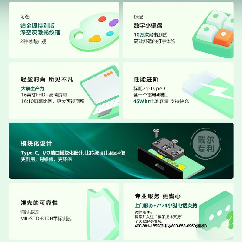 可选 铂金银特别版 深空灰激光纹理 2种时尚外观 Type-C、I/O端口模块化设计,比传统设计坚固4倍, 更耐用,易维修,更环保 标配 数字小键盘 10万次敲击测试 高效舒适的打字体验 轻盈时尚 所见不凡 大屏生产力 16英寸FHD+高清屏幕 16:10屏幕比例,更大可视面积 性能进阶 标配2个Type C 含一个雷电4端口 45Whr电池容量 支持快充 模块化设计 领先的可靠性 通过多项 MIL-STD-810H军标测试 专业服务 更省心 上门服务+7*24小时电话支持 微信服务: 搜索并关注"戴尔技术支持" 全天候服务专线: 400-881-1852(手机)/800-858-0950(座机) % 新浪财经APP 24 川下三 深 FFF 下载APP > 广告 可选 铂金银特别版 深空灰激光纹理 2种时尚外观 大屏生产力 16英寸FHD+高清屏幕 16:10屏幕比例,更大可视面积 性能进阶 标配2个Type C 含一个雷电4端口 45Whr电池容量 支持快充 模块化设计 Type-C、I/O端口模块化设计,比传统设计坚固4倍, 更耐用,易维修,更环保 标配 数字小键盘 10万次敲击测试 高效舒适的打字体验 ...