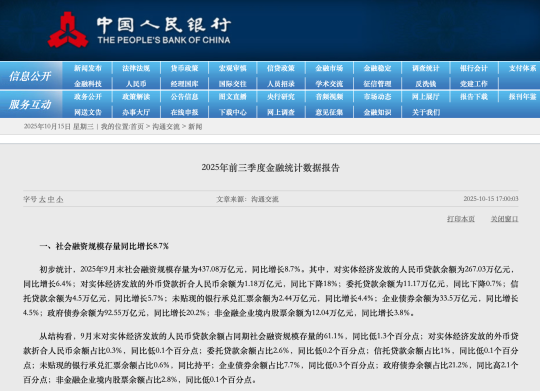 中国人民银行10月15日发布的前三季度金融统计数据报告显示,初步统计,今年前三季度,社会融资规模增量累计突破30万亿元,达到30.09万亿元,比 上年同期多4.42万亿元;人民币贷款增加14.75万亿元,人民币存款增加22.71万亿元。 作为衡量金融总量的核心指标——社融增速、广义货币(M2)增速延续高位,表明货币金融持续为经济回升向好创造适宜的环境。9月末,社融存量增速 同比增长8.7%,比上年同期高0.7个百分点;广义货币(M2)增速同比增长8.4%,比上年同期高1.5个百分点。 | | | 单从9月数据看,当月社融增量、新增人民币贷款表现较为平稳。值得注意的是,作为反映资金活化程度的狭义货币(M1)增速近几个月回升态势明显, 9月末升至7.2%,比今年2月末的年内低点大幅提升了7.1个百分点。市场人士分析认为,今年以来M1、M2"剪刀差"明显收敛,反映出企业生产经营活跃度 提升、个人投资消费需求回暖等积极信号。 中国人民银行此次将原有的三篇新闻稿《金融统计数据报告》《社会融资规模存量统计数据报告》《社会融资规模增量统计数据报告》合并为一篇《金融 统计数据报告》。同时,为保证各方面获取金融统计数据的全面性 ...
