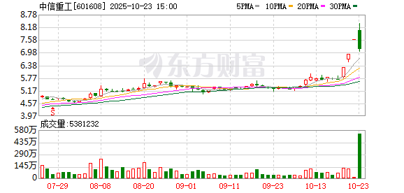 Core Viewpoint - The stock of CITIC Heavy Industries (601608) experienced a decline of 5.80% on October 23, with a trading volume of 4.121 billion yuan and a fluctuation of 18.95% [2] Trading Activity - The stock had a turnover rate of 11.83% for the day, with net buying from the Shanghai-Hong Kong Stock Connect amounting to 115 million yuan, while the total net selling from brokerage seats reached 19.1295 million yuan [2] - The top five brokerage seats accounted for a total transaction volume of 645 million yuan, with a net buying amount of 95.5763 million yuan [2][3] - The largest buying and selling brokerage was the Shanghai-Hong Kong Stock Connect, with buying amounting to 190.2247 million yuan and selling amounting to 75.5188 million yuan [3] Fund Flow - The stock saw a net outflow of 654 million yuan from main funds, with a significant outflow of 471 million yuan from large orders [2] - Over the past five days, the net outflow of main funds totaled 340 million yuan [2] Margin Trading Data - As of October 22, the margin trading balance for the stock was 800 million yuan, with a financing balance of 785 million yuan and a securities lending balance of 14.5174 million yuan [2] - The financing balance increased by 168 million yuan over the past five days, representing a growth of 27.21%, while the securities lending balance increased by 3.7207 million yuan, a rise of 34.46% [2] Financial Performance - In the first half of the year, the company reported a revenue of 3.981 billion yuan, reflecting a year-on-year growth of 2.35%, and a net profit of 203 million yuan, which is a 6.39% increase compared to the previous year [3]