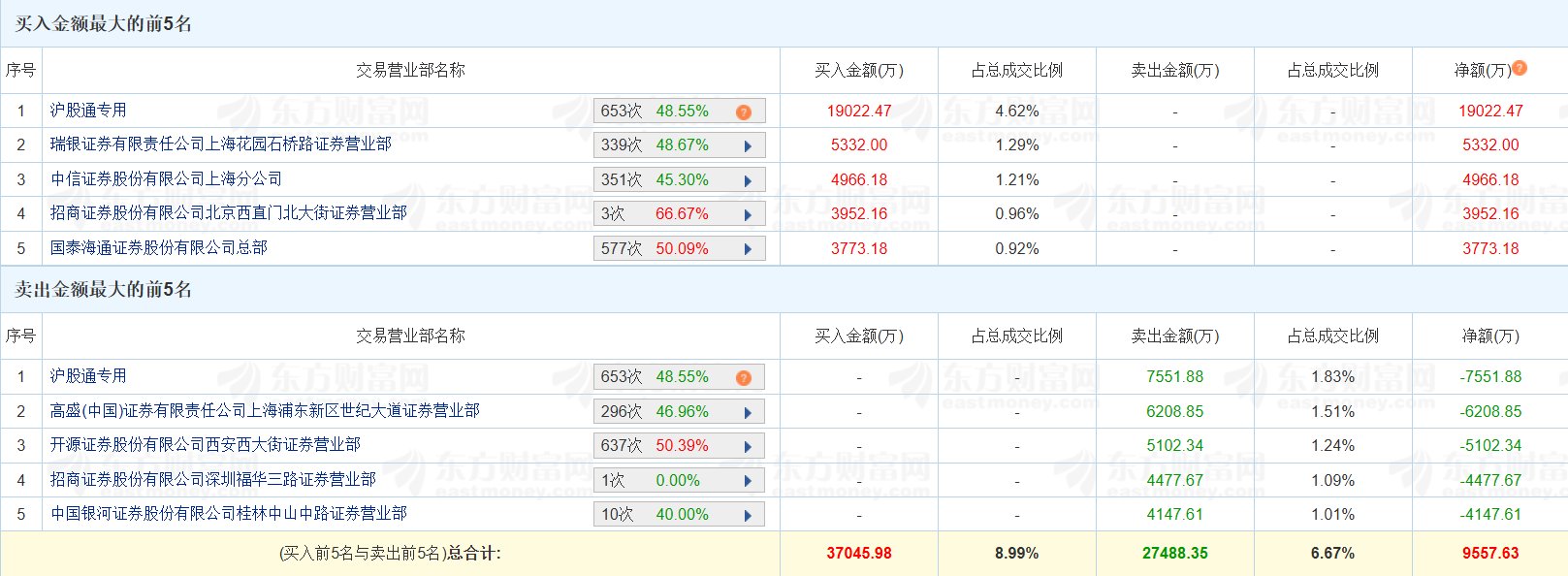 | 序号 | 交易营业部名称 | | 买入金额(万) | 占总成交比例 | | --- | --- | --- | --- | --- | | 1 | 沪股通专用 | 653次 48.55% 2 | | | | 2 | 高盛(中国)证券有限责任公司上海浦东新区世纪大道证券营业部 | 296次 46.96% | | | | 3 | 开源证券股份有限公司西安西大街证券营业部 | 637次 50.39% | | | | র্ব | 招商证券股份有限公司深圳福华三路证券营业部 | 1次 0.00% | | | | 5 | 中国银河证券股份有限公司桂林中山中路证券营业部 | 10次 40.00% | | | | | (买入前5名与卖出前5名)总合计: | | 37045.98 | 8.99% | 中信重工(601608.SH)今日跌5.8%,换手率11.83%,成交额41.21亿元。龙虎榜数据显示,沪股通买入1.9亿元同时卖出7552万元,净买入1.15亿元;游资"量 化打板"位列卖三席位,卖出5102万元。上榜席位全天买入3.7亿元,卖出2.75亿元,合计净买入9558万元。(格隆汇) | 买入金额最大的前5名 | ...