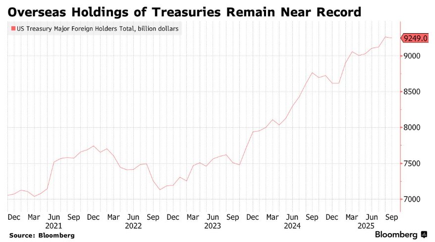 美国政府结束停摆之后公布的最新美债持仓数据显示,9月份海外国家所持有的美国国债规模仍接近历史最高位,这也意味着此前不久在 8月创下新的美债持仓历史最高位之后,海外国家整体持有的美国国债规模仅仅呈现出略有回落。最新的海外国家美债持仓凸显出那些嘴 上说着"抛售美国"与"美国例外论已经处于崩塌进程"的海外主权财政机构以及大型私人投资机构们实际上正在趁着美债价格在降息预期催 化之下的上行时期疯狂买入美债资产或者在收益率反弹时候趁机大举逢低买入美债。 "期限溢价"持续大幅缓解叠加美联储降息预期升温之下的借贷成本下降,美债投资回报持续上升,而且迄今为止最为糟糕的那些经济预 测展望,尤其是关于通胀的悲观预测,基本上都未能成真。事实上,规模达30万亿美元的美国国债交易市场持续火热,以美债价格波动 计价的投资回报今年迄今接近7%,正朝着自2020年以来的最佳美债投资年份迈进。 据了解,具体的细节数据显示,美国国债第二大持有国英国选择了在9月份缩减持仓,而日本的美债持仓则升至三年多来的最高水平。 9月份,海外投资机构们合计持有价值约9.25万亿美元的美国国债,而前一个月则为9.26万亿美元这一历史最高持仓规模。值得注意的 是,持 ...