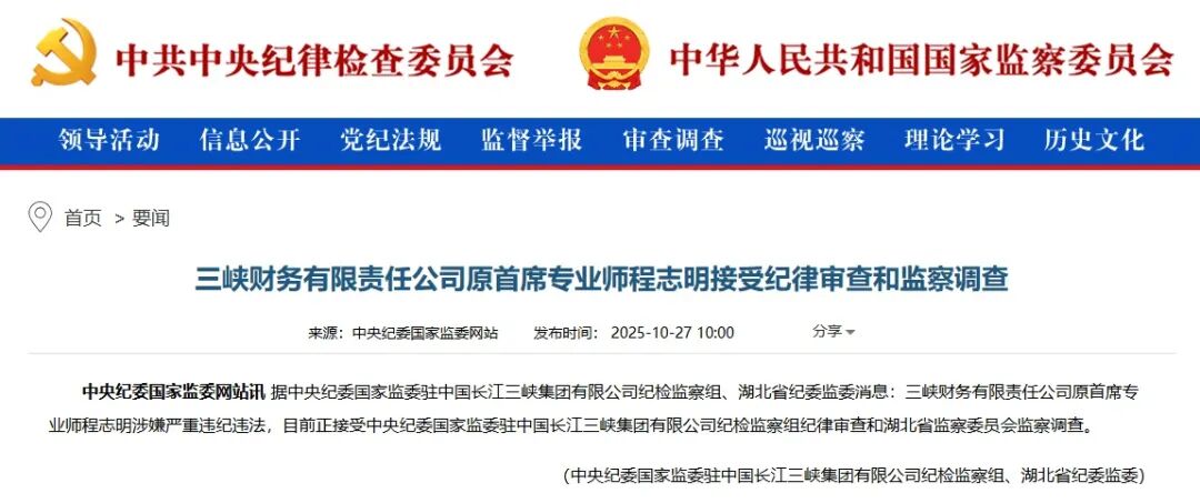 Core Points - The former chief professional of China Three Gorges Finance Co., Cheng Zhiming, is under investigation for serious violations of discipline and law, highlighting ongoing scrutiny of state-owned financial institutions [1][3] - This incident follows a pattern of investigations into high-ranking officials within the company, indicating a stringent regulatory environment [3]   Summary by Sections  Company Investigation - Cheng Zhiming, who was approved as chairman of China Three Gorges Finance Co. in November 2020, is currently undergoing disciplinary review and investigation by the Central Commission for Discipline Inspection [1] - The company has seen previous high-level investigations, including that of former deputy general manager Bi Jiajun in January 2024 for similar violations [3]   Regulatory Environment - The investigation of Cheng Zhiming reflects a broader trend of increased oversight and enforcement actions against misconduct in state-owned financial institutions [3] - Other financial companies in the power sector, such as China Power Finance Co. and China Shipbuilding Group Finance Co., have also faced similar scrutiny, with multiple high-ranking officials being investigated since 2019 [3]