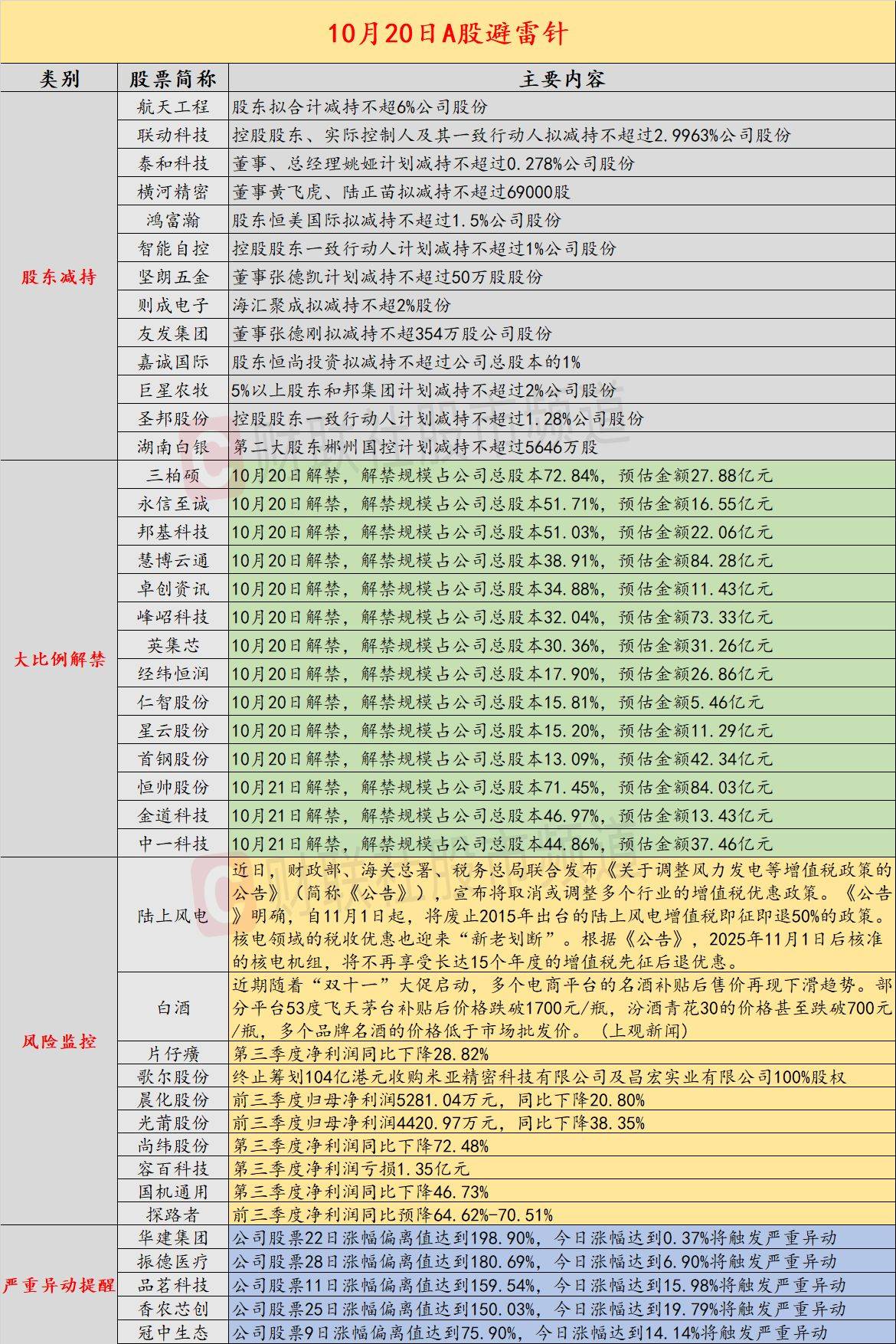 最近资本市场可谓风起云涌,财政部一纸公文就废除了风电行业长达8年的税收优惠,核电15年的补贴也进入倒计时。更让人意外的是,"双十一"还没到, 茅台价格就先"跳水"了,电商平台直接杀到1700元以下。表面看是促销战,但作为一个浸淫市场多年的量化投资者,我嗅到了不寻常的气息。 | | 统计信息 | | | --- | --- | --- | | 起始价: 1011.50 | 终止价:5667.33 | 涨跌幅: +460.29% | | 最高价: 6124.04 | 最低价:1004.08 | 振幅: 506.18% | | 阳线:346 | 平线:0 | 阴线:207 | | 总量: 345.53亿 | 金额: 32.93万亿 | | | | | | 类别 | 股票简称 | 主要内容 | | --- | --- | --- | | | 航天工程 | 股东拟合计减持不超6%公司股份 | | | 联动科技 | 控股股东、实际控制人及其一致行动人拟减持不超过2.9963%公司股份 | | | 泰和科技 | 董事、总经理姚姬计划减持不超过0.278%公司股份 | | | 横河精密 | 董事黄飞虎、陆正苗拟减持不超过69 ...