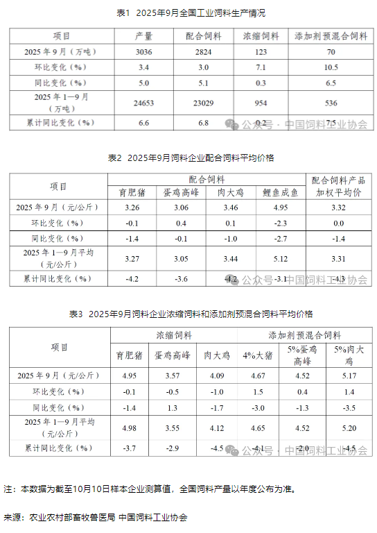 (文章来源:新华财经) 新华财经北京10月22日电农业农村部畜牧兽医局与中国饲料工业协会共同发布2025年9月份全国饲料生 产形势。2025年9月,全国工业饲料产量3036万吨,环比增长3.4%,同比增长5.0%。其中,配合饲料、 浓缩饲料、添加剂预混合饲料同比分别增长5.1%、0.3%、6.5%。主要饲料产品出厂价格同比下降,畜 禽配合饲料、添加剂预混合饲料出厂价格环比以增为主,浓缩饲料出厂价格环比小幅下降。饲料企业生 产的配合饲料中玉米用量占比为33.6%,同比下降2.4个百分点;配合饲料和浓缩饲料中豆粕用量占比为 14.3%。 2025年三季度,全国工业饲料总产量24653万吨,同比增长6.6%。其中,配合饲料、浓缩饲料、添加剂 预混合饲料产量分别为23029万吨、954万吨、536万吨,同比分别增长6.8%、0.2%、7.5%。主要配合饲 料、浓缩饲料、添加剂预混合饲料产品出厂价格同比呈下降趋势。 | 项目 | | 浓缩饲料 | | | 添加剂预混合饲料 | | | --- | --- | --- | --- | --- | --- | --- | | | 育肥猪 | 蛋鸡高峰 | 肉大鸡 | 4%大 ...
