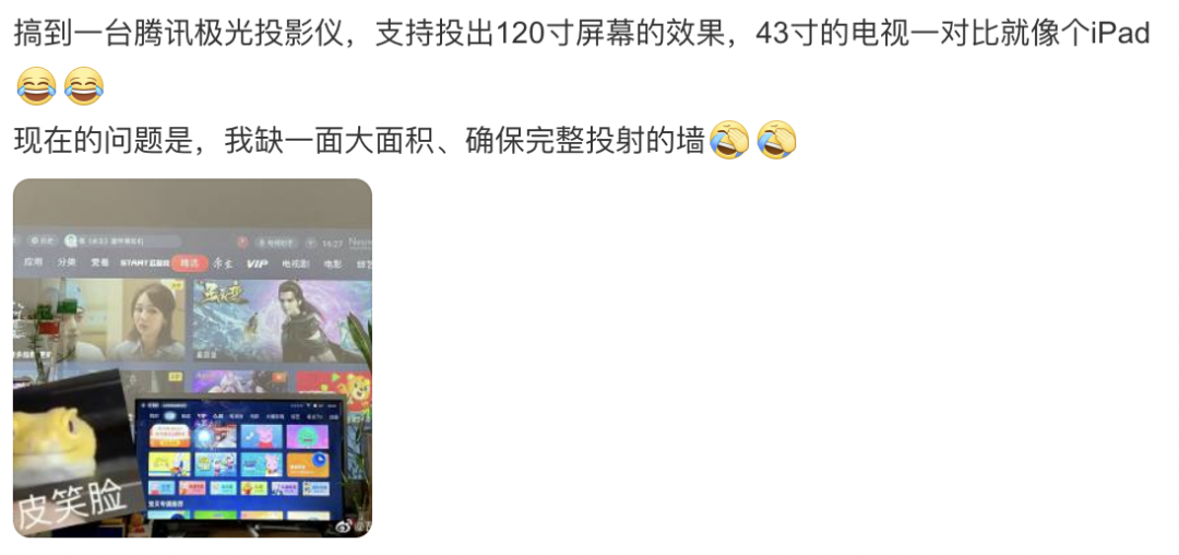 来源:乌鸦校尉 鹅厂为了让自己的视频观影效果更佳,的确也在设备画质上花了更多心思。 这台投影仪一拿到手我就超级喜欢。 因为它只有3个配件:主机、电源线、遥控器。 即插即用,不需要学习,很简单! 自带云台也超级实用~ 能支持360度自由旋转的稳定底座,想坐着看站着看躺着看都行,完全不用担心家里没地儿放。 再来看看投影仪的重中之重:投影效果。 自动对焦、梯形校正自然是基本功。 (现在的设备就是很智能了,不需要操作什么,它自己扫描到不对劲就会开始校正,老年人也不用担心不会调) 不需要手动操作 腾讯极光的投影仪一直都是有口皆碑的。 就连大角度斜着着放都可以! 自动识别角度矫正,还不损画质。 放在床头柜上 可以投影到床的正前方 画质也没得说! 自研的全封闭光机。 大大提升投影亮度、画面饱和度。 为了让大家能更直观地get到投影仪的工作效果,我们专门模拟了多个场景下的使用效果—— 晚上关灯: 像是在家里支起专属于你的影院~ 投影仪的亮度是635CVIA,这个亮度我觉得是家用最佳的: 既足够鲜亮,又不会刺眼,看起来很舒服。 开几盏氛围小灯: 无差别。这种程度的小灯一点儿也削弱不了它。 卧室关灯,外面开灯: 不影响,该清晰还 ...