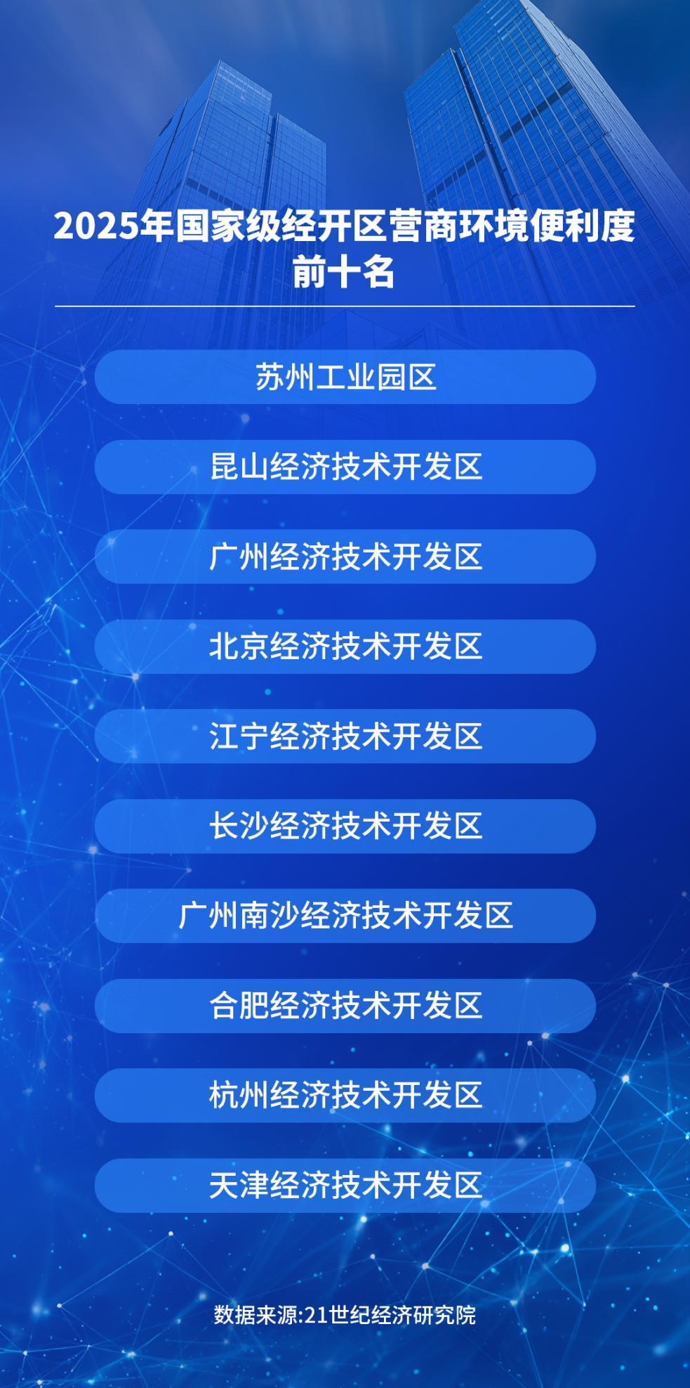 在日前发布的《全国经开区高质量发展报告2025》(以下简称《报告》)中,昆山开发区位列全国第二。报告发布之时,正值各地围绕新 一轮高质量发展目标,持续优化营商环境的关键阶段。 进入"十五五"前期,营商环境正在从一项重要工作,转变为衡量区域竞争力的核心尺度。如何通过更加稳定、透明、可预期的制度安排,激 发市场主体活力、支撑产业转型升级,成为国家级经开区普遍面对的现实课题。 在这一背景下,21世纪经济研究院选取商务部2021—2024年度国家级经开区综合发展水平考核中排名前列的20家经开区作为研究对象,对 其高质量发展状况、阶段性进展和制度实践进行系统梳理,并结合典型案例,对各地2024年度营商环境便利度表现进行专章分析。 从报告视角回看,昆山开发区此次位列全国第二,并非源于某一项指标的"突进",而是产业基础、制度供给与项目交付能力在长期运行中相 互叠加、逐步显现的结果。 项目招引:从单点突破到制度支撑 过去40年来,国家级经开区不断推进管理体制和运行机制改革,逐步形成以管委会为核心、市场化运作相配套的治理模式,为项目落地提 供了制度基础。 《报告》将"以并联审批等举措擦亮'昆如意''开心办'品牌"列为全国经开区 ...