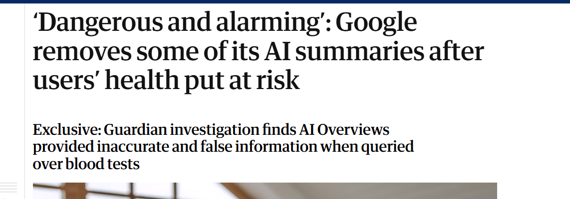 【环球网科技综合报道】1月12日消息,《卫报》调查发现谷歌一些人工智能生成的健康摘要信息存在虚假和误导性,使人们面临伤害风险,随后谷歌删除 了部分此类摘要。 据此前报道,《卫报》发现,用户输入"肝功能血液检查的正常范围是多少"会得到大量数字,几乎没有任何背景信息,也没有考虑患者的国籍、性别、种族 或年龄。 专家表示,谷歌人工智能概览中定义的"正常"可能与实际的正常标准存在巨大差异。这些概览可能导致重症患者误以为自己检测结果正常,从而忽略后续的 医疗检查。 调查结束后,该公司已删除了针对"肝血检查正常范围是多少"和"肝功能检查正常范围是多少"这两个搜索词的 AI 概览。 谷歌发言人表示:"我们不对搜索中的个别内容移除事件发表评论。如果人工智能概览缺少某些上下文信息,我们会努力进行全面改进,并在适当情况下根 据我们的政策采取行动。"(思瀚) ...