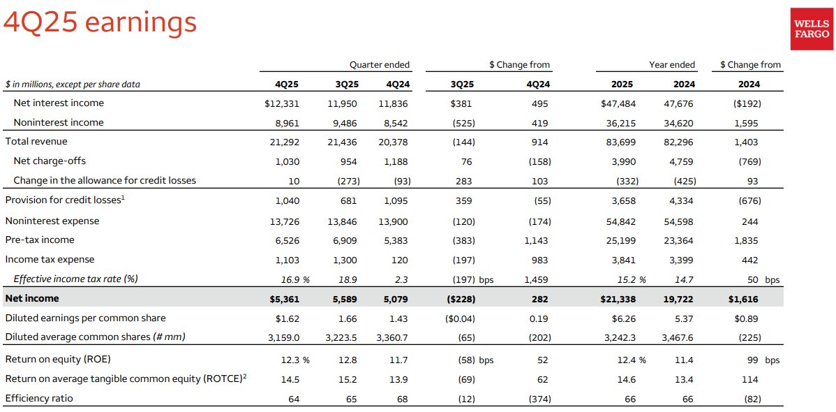 该季度净利息收入(NII)为123.3亿美元,同比增长4%,低于分析师预测的124亿美元,这是贷款业务的主要利润来源。这使得全年净利息收入达到475亿美 元,接近其此前预测的2025年净利息收入与2024年基本持平。Q4非利息收入为89.6亿美元,同比增长5%。 富国银行(WFC.US)公布了第四季度财务业绩。数据显示,Q4营收为212.9亿美元,同比增长4%,略低于华尔街预期的216亿美元。Q4非GAAP每股收益为 1.76美元,高于市场预期的1.69美元。富国银行2025年净利润达到213亿美元,而分析师此前预计为216亿美元。 | | | | Quarter ended | | $ Change from | | Year ended | $ Change fr | | --- | --- | --- | --- | --- | --- | --- | --- | --- | | $ in millions, except per share data | 4Q25 | 3Q25 | 4024 | 3Q25 | 4Q24 | 2025 | 2024 | 2024 | | Net interest inc ...