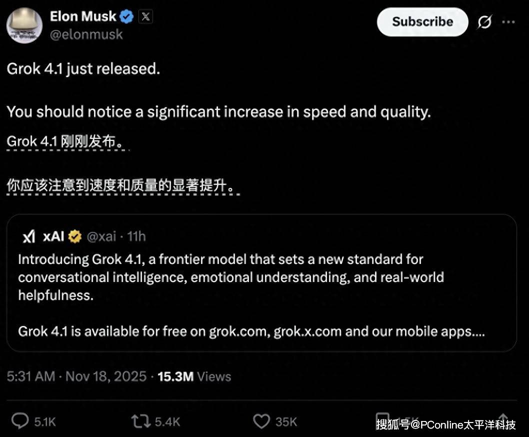 Core Insights - The latest version of the large language model, Grok 4.1, was launched by Elon Musk's xAI, showcasing significant improvements in speed and quality compared to its predecessor Grok 4, which was released just four months prior [1][14] Performance Enhancements - Grok 4.1 has undergone targeted optimizations to reduce hallucinations, achieving a hallucination rate of approximately 4%, down from around 12% in Grok 4, marking a nearly threefold decrease [3] - The model has shown substantial improvements in emotional intelligence and creative writing, scoring 1586 on the EQ-Bench emotional intelligence test, up from 1206 in Grok 4 [6] User Experience - In blind testing conducted by LMArena, Grok 4.1 achieved a preference rate of 64.78% over its predecessor, indicating strong user approval [8] - The model is accessible for free to all users across various platforms, including grok.com, X platform, and the Grok App on iOS and Android, with a default setting for Auto mode to Grok 4.1 [12] Market Position - xAI's rapid development cycle is highlighted by the swift transition from Grok 4 to 4.1, achieving a top ranking in performance metrics within six months, contrasting with the slower update cycles of competitors [14]