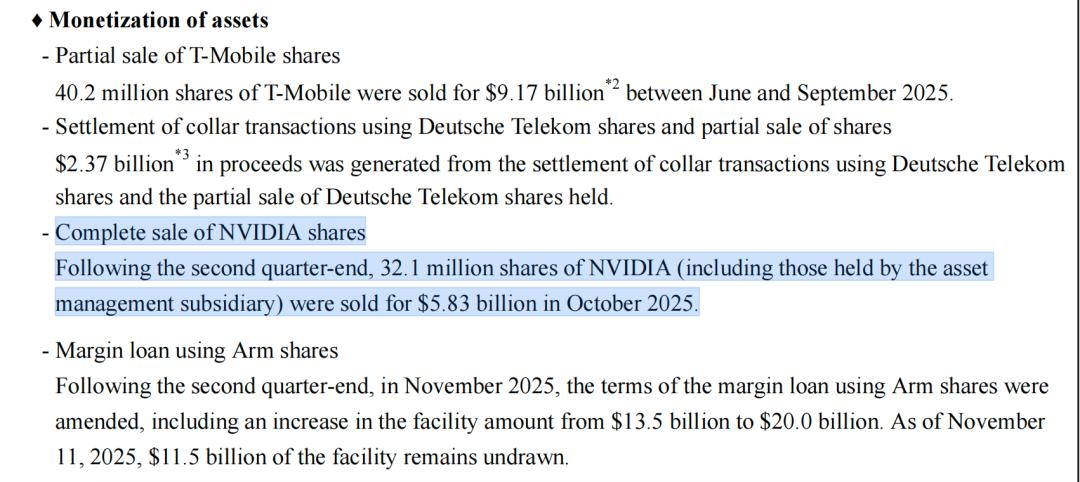 11月11日,日本软银集团凭借一纸报纸瞬间引爆市场。"亚洲巴菲特"孙正义又一次"抛弃"了"五万亿市值掌舵人"黄仁勋。 软银在最新发布的第二财季报告中披露,其已于10月份出售所持全部英伟达股份,合计3210万股。10月英伟达股价一路看涨,孙正义果断高位套现58.3亿 美元(合人民币约415亿元)。 值得注意的是,软银集团创始人孙正义计划进行一系列投资,构建在人工智能领域的影响力,并将注意力转向OpenAI、甲骨文等人工智能科技公司。 财报显示,软银集团在今年3月份,与OpenAI达成最终协议,对其追加实际投资金额300亿美元。而软银首席财务官后藤芳光在财报说明会上表示:"软银 将在12月对OpenAI额外投资225亿美元。" (图源:软银财报) 孙正义十年陪伴,最终少赚1600亿美元 细数软银与英伟达之间投资关系,美好中难掩几分遗憾。 孙正义与英伟达的缘分早在十年前埋下伏笔。2014年,深度学习技术尚处于实验室阶段,英伟达的GPU因并行计算优势被研究者发掘,但彼时英伟达股价 低迷,远不及现在。当时更多投资者将英伟达看作是一家游戏显卡公司,但眼光独到的孙正义将其锁定为"AI基础设施的基石"。甚至有消息称,当年孙正 ...