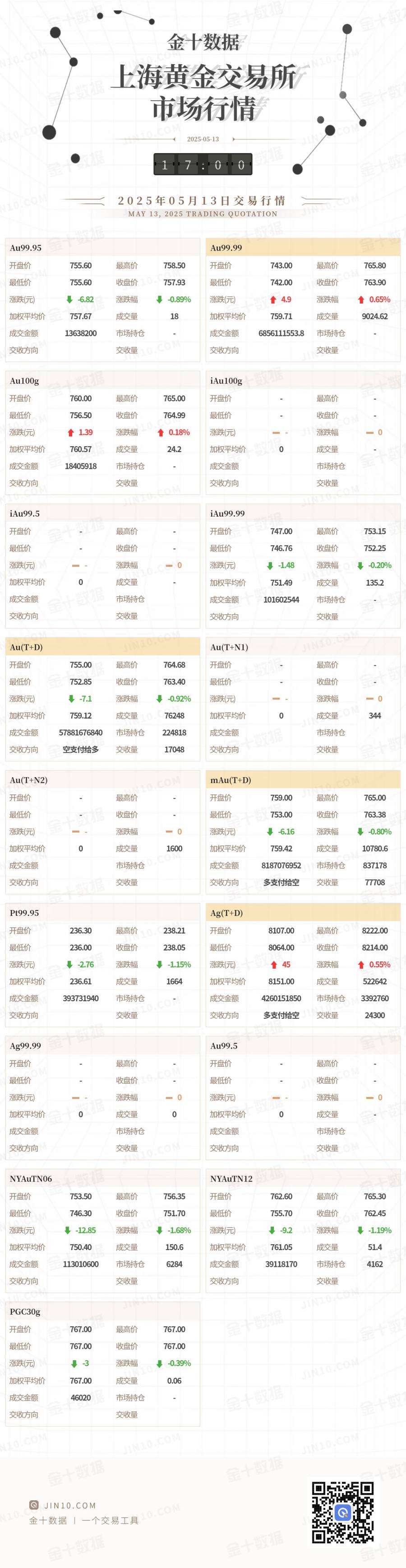 金十图示:2025年05月13日(周二)上海黄金交易所市场行情 @ JIN10.COM 金十数据 | 一个交易工具 | Au99.95 | | | | Au99.99 | | | | | --- | --- | --- | --- | --- | --- | --- | --- | | 开盘价 | 755.60 | 最高价 | 758.50 | 开盘价 | 743.00 | 最高价 | 765.80 | | 最低价 | 755.60 | 收盘价 | 757.93 | 最低价 | 742.00 | 收盘价 | 763.90 | | 涨跌(元) | 1 -6.82 | 涨跌幅 | 1 -0.89% | 涨跌(元) | ↑ 4.9 | 涨跌幅 | ↑ 0.65% | | 加权平均价 | 757.67 | 成交量 | 18 | 加权平均价 | 759.71 | 成父章 | 9024.62 | | 成交金额 | 13638200 | 市场持仓 | | 成交金额 | 6856111553.8 | 市场持仓 | | | 交收方向 | | 交收量 | | 交收方向 | | 交收量 | | | Au100g | | | | i ...