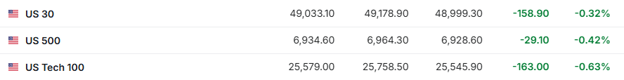 盘前市场动向 1. 1月14日(周三)美股盘前,美股三大股指期货齐跌。截至发稿,道指期货跌0.32%,标普500指数期货跌0.42%,纳指期货跌 0.63%。 | = US 30 | 49,033.10 | 49,178.90 | 48,999.30 | -158.90 | -0.32% | | --- | --- | --- | --- | --- | --- | | 트 US 500 | 6,934.60 | 6,964.30 | 6,928.60 | -29.10 | -0.42% | | 트 US Tech 100 | 25,579.00 | 25,758.50 | 25,545.90 | -163.00 | -0.63% | 2. 截至发稿,德国DAX指数跌0.41%,英国富时100指数涨0.26%,法国CAC40指数涨0.03%,欧洲斯托克50指数跌0.24%。 | I 德国DAX30 | 25,307.57 | 25,474.72 | 25,299.11 | -103.87 | -0.41% | | --- | --- | --- | --- | --- | --- | | 英国富时100 | ...