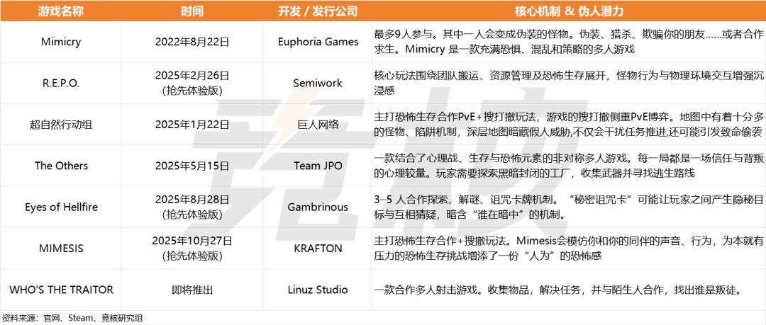 Core Insights - The article discusses the rising trend of horror survival games with "imposter" mechanics, highlighting that this genre is not entirely new but is gaining traction among various companies [1][21] - KRAFTON has entered this niche with its game "MIMESIS," which features horror survival and imposter gameplay, indicating a strategic shift similar to its previous success with "PUBG" [3][21] Game Overview - "MIMESIS" was released in early access on Steam, allowing players to experience a game where one player can disguise as a monster, creating a mix of fear, chaos, and strategy [2] - The game has received mixed reviews regarding its quality, with players noting issues such as lack of guidance and resource scarcity, but it still attracts a player base due to its unique mechanics [3][4] Gameplay Mechanics - The core gameplay loop involves scavenging for resources, selling them, and purchasing tools, with the constant threat of imposters or environmental dangers interrupting the cycle [4][9] - The "imposter" mechanism allows AI to mimic player appearances and voices, creating social tension and trust issues among players, which is a significant aspect of the game's design [8][11] Market Trends - The horror survival genre is seeing a shift towards cooperative and social gameplay, with the "imposter" mechanic enhancing player interaction and engagement [21][23] - Companies like KRAFTON, Semiwork, and Team JPO are exploring similar game concepts, indicating a competitive landscape that has not yet fully matured [21][23] Comparative Analysis - "MIMESIS" shares similarities with other titles in the horror survival genre, particularly "Lethal Company," which also incorporates imposter elements, suggesting a trend towards blending horror with social deduction mechanics [20][21] - The article identifies two main branches of imposter gameplay: social deduction and horror disguise, with various games exemplifying these mechanics [14][16]