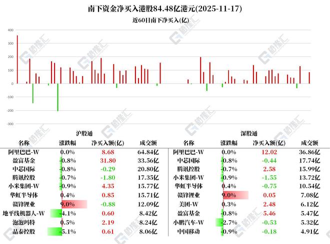 南向资金追踪|净买入超84亿港元 再度加仓阿里和小米流出赣锋锂业