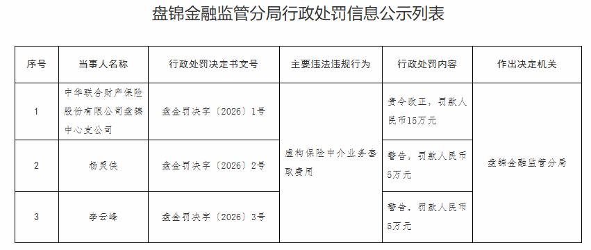 | 序号 | 当事人名称 | 行政处罚决定书文号 | 主要违法违规行为 | 行政处罚内容 | 作出决定机关 | | --- | --- | --- | --- | --- | --- | | 1 2 | 中华联合财产保险 股份有限公司盘销 中心支公司 杨灵侠 | 盘金罚决字(2026) 1号 盘金罚决字(2026) 2号 | | 责令改正,罚款人 民币15万元 | 在令她呈虚必影排 | | | | | 虚构保险中介业务套 | 警告,罚款人民币 | | | | | | 取寄用 | 5万元 | | | 3 | 李云峰 | 盘金罚决字(2026) 3号 | | 警告,罚款人民币 5万元 | | (责任编辑:徐自立) 以下为原文: 中国经济网北京1月9日讯 国家金融监督管理总局网站1月8日发布盘锦金融监管分局行政处罚信息公示列表。中华联 合财产保险股份有限公司盘锦中心支公司、杨灵侠、李云峰存在以下违法违规行为:虚构保险中介业务套取费用。 盘锦金融监管分局决定对中华联合财产保险股份有限公司盘锦中心支公司责令改正,罚款人民币15万元;对杨灵侠 处以警告,罚款人民币5万元;对李云峰处以警告,罚款人民币5万元。 ...