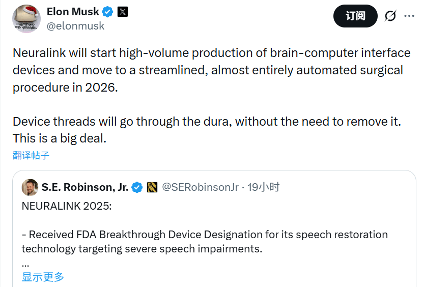 世界首富马斯克披露,他的脑机接口公司Neuralink计划在2026年大幅提高脑机设备的产量,还将在脑机植入方式上实现创新。 在本周的一篇社交媒体回帖中,马斯克表示,Neuralink将于2026年开始对其脑机接口设备进行大规模生产(high-volume production),并将推进一种流 程高度精简、几乎完全自动化的手术方案。 马斯克还透露,接下来设备中的电极丝将直接穿过硬脑膜,而无需将其切除——这是一项非常重大的突破。 (来源:Neuralink官网) 来源:科技日报、智通财经 (手术方式介绍,来源:Neuralink官网) ...