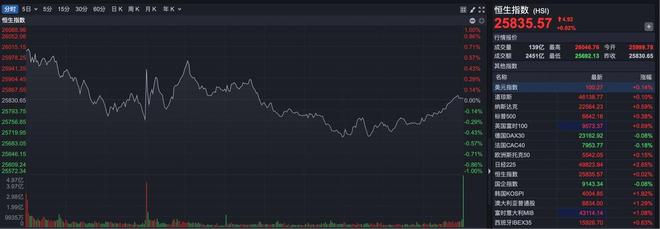 Market Overview - The Hong Kong stock market experienced a weak fluctuation but managed to close slightly higher, with the Hang Seng Index ending at 25,835.57 points, up 4.92 points, or 0.02% [2][4] Sector Performance - The real estate sector showed overall strength, with notable gains from companies such as Sunac China, which rose over 12% at one point and closed up over 6%. Other companies like Country Garden, Vanke, and New World Development also saw increases of over 3% [5][7] - The banking sector performed well, with Minsheng Bank rising over 3% and several other banks, including Postal Savings Bank and Bank of China, gaining over 1% [8][10] Company-Specific Developments - Xinda International Holdings experienced a significant surge, with a rise of 66% at one point and closing up over 29%. This increase is attributed to the merger of CICC with Xinda Securities and Dongxing Securities, which aims to enhance the company's capabilities and shareholder returns [10] - The technology sector showed mixed results, with Baidu and Kuaishou rising over 2%, while companies like Xiaomi and Bilibili fell over 2% [11] Investment Outlook - CITIC Securities noted that the Hong Kong stock market remains undervalued compared to other major global markets, with a current ERP of 5.7%. The market is expected to benefit from the influx of quality A-share companies listing in Hong Kong and the ongoing narrative around AI, leading to a potential recovery in valuations and performance by 2026 [13]