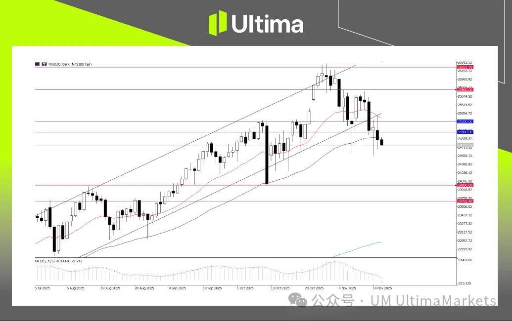 每日市场展望 – 2025年11月18日,由 Ultima Markets 提供。 ·非农就业(NFP):延迟的9月就业报告已确认将于本周四(11月20日)发布,是评估劳动力市场强弱的关键参考。 ·CPI / PCE 数据:通胀数据随后公布。美联储偏好的通胀指标PCE 及修订后的第三季度 GDP 将于11月26日发布。 股市与风险资产:回调验证弱势 今日交易以高风险头寸为特征,投资者关注明日关键的英伟达财报发布以及美联储政策路径的不确定性。继上周大幅回调后,市场情绪已明确转向 风险规避模式(Risk-Off)。 本周市场以防御姿态开局,投资者在迎接重大宏观数据及关键财报事件(英伟达)前,风险偏好明显下降。 科技板块与美国数据展望 目前,股市及广泛风险资产走势呈震荡下行,情绪受持续结构性风险主导:美联储政策路径不确定、大型科技股估值风险,以及市场对今年反弹可 持续性的疑虑。 全球股市在英伟达第三季度财报公布前(11月19日周三美股收盘后)几乎屏息以待。AI驱动的市场反弹未来走向,将由这一单一事件决定。 近期纳斯达克的抛售主要源于市场对AI 行业高估值的担忧。作为 AI 主题最具影响力的股票、纳斯达克最大成分股, ...