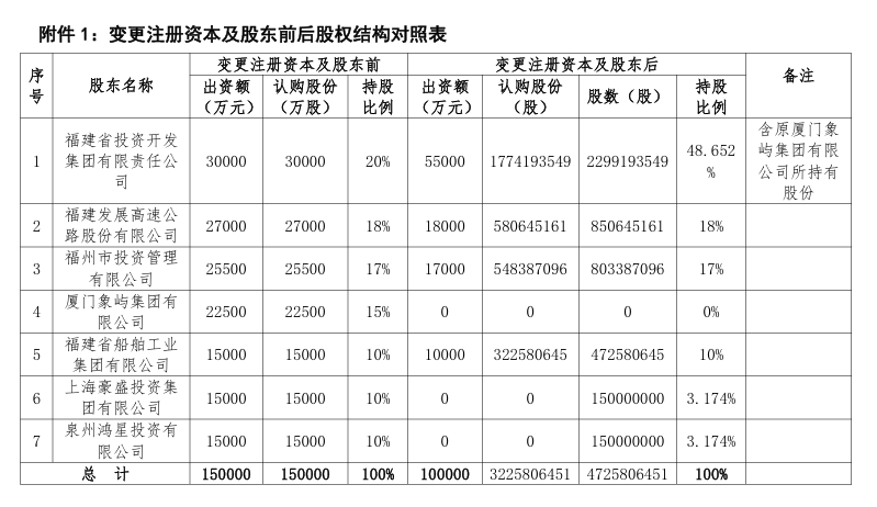 | 附件 1: 变更注册资本及股东前后股权结构对照表 | | --- | 公司股东厦门象屿集团有限公司拟将其所持有的全部公司股权(合计22500万股股份,总股本占比15%)以及由该 股权而派生的所有权益,转让给公司股东福建省投资开发集团有限责任公司。本次股份转让和增资完成后,厦门 象屿集团有限公司将退出海峡金桥财险股东行列,福建省投资开发集团有限责任公司持股比例由20%提升至 48.652%。上述变更注册资本及股东事项待福建金融监管局批准程序后生效。 责任编辑:栎树 关键词阅读:海峡金桥财险 增资 1月7日,海峡金桥财险发布公告称,公司于2025年12月30日召开的2025年第五次股东大会(临时会议),审议通 过了《海峡金桥财产保险股份有限公司关于变更注册资本及股东的议案》。公司拟增资10亿元,发行股份32.26亿 股。经股东优先认购程序和投资者认购后,最终确定福建省投资开发集团有限责任公司、福建发展高速公路股份 有限公司、福州市投资管理有限公司、福建省船舶工业集团有限公司认购公司新增股份。以上投资者认购公司股 份的认购金额均计入公司注册资本,增资后注册资本变更为25亿元。 | 月 | | | 变更注册资本及 ...
