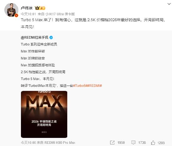 1月5日,小米 REDMI Turbo 系列手机官宣迎来全新成员,REDMI Turbo 5 Max 手机将于本月发布。 | @REDMI红米手机 0 | | | | --- | --- | --- | | Turbo 系列迎来全新成员 | | | | Max 的性能关吸 | | | | Max 的续航组合 | | | | Max 的旗舰质感与体验 | | | | 2.5K 档性能之战, 开局即终局 | | | | Turbo 5 Max, 本月见! | | | | 转评'Turbo5Max本月见",抽送一台#Turbo5##REDM# | | | | 2026 中端性能之 B | | | | 求用品 | | | | 今天10:00 来自 REDMI K90 Pro Max | 1 1950 | : 1736 לד 1203 | 责任编辑:王翔 责任编辑:王翔 1月5日,小米 REDMI Turbo 系列手机官宣迎来全新成员,REDMI Turbo 5 Max 手机将于本月发布。 小米集团合伙人、总裁卢伟冰转发该博文并表示:"我有信心,这就是2.5K价格档2026年最好的选择。 开局即终局,本月见!" 小米集 ...