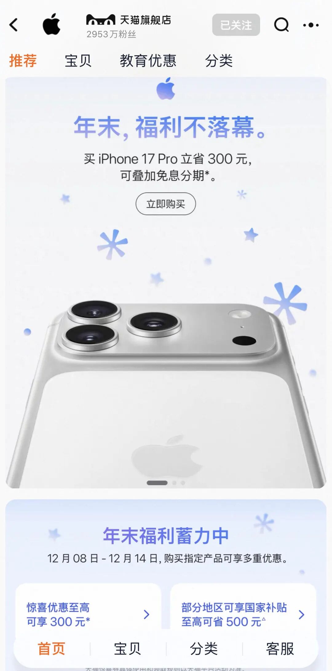 (来源:深圳商报) 苹果,突然降价! 12月8日,苹果官方宣布在京东、天猫等平台的旗舰店推出年末降价活动。其中,iPhone 17 Pro及iPhone 17 Pro Max机型每部降价300元,优惠后,iPhone 17 Pro售价8699元/部起,iPhone 17 Pro Max售价9699元/部起。此外,部分地区可享国家补贴,最高可省500元/部。 年末福利冒力中 M 12 月 08 日 - 12 月 14 日,购买指定产品可享多重优惠。 部分地区可享国家补贴 惊喜优惠至高 > 至高可省 500元ª 可享 300 元* 首页 分类 宝贝 客服 Apple产品京东自营旗舰店 > 已关注 自营 9319.1万人关注 )0万PLUS会员关注 ■ 近180天超100万PLUS会员加购 | ● 高关注数 Apple 全方位服务,尽在京东。v 精选 商品 12.12 活动火爆开启,指定 iPhone 17 Pro 优惠千元。 立即查看 12.12 Apple 全线产品 近年来,苹果已逐步调整其定价策略,改变了此前新品发布后官方渠道鲜少迅速降价的传统。记者注意到,若与去年iPhone 16全系列可领取500元优惠券 ...