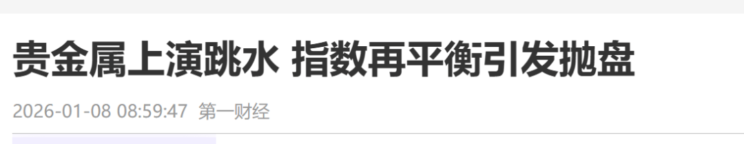 Core Viewpoint - The precious metals market is experiencing a liquidity shock triggered by the rebalancing of the Bloomberg Commodity Index (BCOM), leading to significant price declines in gold, silver, and other metals [1][15][17]. Group 1: Market Adjustments - On January 8, the precious metals market saw a collective adjustment, with spot gold dropping to around $4,415, COMEX silver falling over 2%, and spot silver declining more than 3% to a low of $75.58 [1]. - The rebalancing process, which began on January 8 and will continue until January 14, involves a reduction in the weight of gold from 20.4% to 14.9% and silver from 9.6% to 3.94% in the BCOM index [15][18]. Group 2: Market Impact - Deutsche Bank and TD Securities anticipate a surge of $7.7 billion in silver sell orders over the next two weeks, equating to 13% of the total open interest in the COMEX silver market [15]. - The rebalancing is expected to result in futures sell-offs that will account for 9% of total silver positions and 3% of total gold positions [15]. Group 3: Historical Context - The decline in precious metals follows a rare and significant price surge, with gold increasing over 70% and silver rising nearly 150% in 2025, leading to a fragile market environment [17]. - The rebalancing is characterized as a large-scale technical sell-off, with analysts noting that the sell pressure on silver will be the most significant, followed by aluminum and gold [18][19]. Group 4: Future Projections - Estimates suggest that a sale of 2.4 million ounces of gold could lead to a price drop of 2.5% to 3%, depending on the sensitivity model used [19]. - Analysts predict that the upcoming sell orders will lead to a substantial repricing of silver, exacerbated by a liquidity vacuum in the market [20].