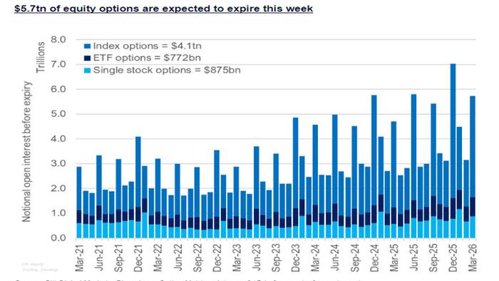 Market Overview - US equities finished lower, with S&P 500 futures down 0.4% and Nasdaq 100 futures down 0.6%, marking a potential fourth consecutive week of losses, the longest losing streak in a year [1] - Brent crude oil prices declined 0.7% to around $108 after earlier gains, while the VIX rose to around 25, indicating increased market volatility [1] - The US Dollar increased by 0.2% as markets adjusted expectations for Fed rate cuts, now pricing in less than 5 basis points for the year, down from 60 basis points last month [1] Corporate News - FedEx shares rose 7% after raising its full-year profit forecast, indicating successful restructuring efforts [5] - Figs Inc. gained 6% following an upgrade to outperform by Oppenheimer, suggesting a sustained recovery [5] - Planet Labs saw a 14% increase in shares after reporting revenue that exceeded analyst estimates [5] - Super Micro Computer Inc. shares fell 26% after a co-founder was charged with illegally diverting Nvidia-powered servers to China [5] - Alibaba and Tencent lost a combined $66 billion in market value after failing to present clear AI profit strategies [3][14] Geopolitical Impact - The ongoing conflict in Iran is affecting global market sentiment, with rising oil prices and geopolitical tensions leading to increased volatility [4][6] - Traders are preparing for a significant options expiry event, with $5.7 trillion in notional options set to expire, which could lead to abrupt price swings [7][9] - The ECB and BoE held rates steady but indicated readiness to act if inflation pressures increase due to the Iran conflict, leading to a sell-off in bonds [41][42] Sector Performance - The construction sector outperformed while energy stocks lagged amid rising crude oil prices [13] - Asian markets reacted negatively to disappointing earnings from tech companies, particularly Alibaba, which reported a 67% drop in Q3 net income [14][23] - The energy sector is under pressure as Brent crude prices are projected to rise significantly if geopolitical tensions persist [19][39]