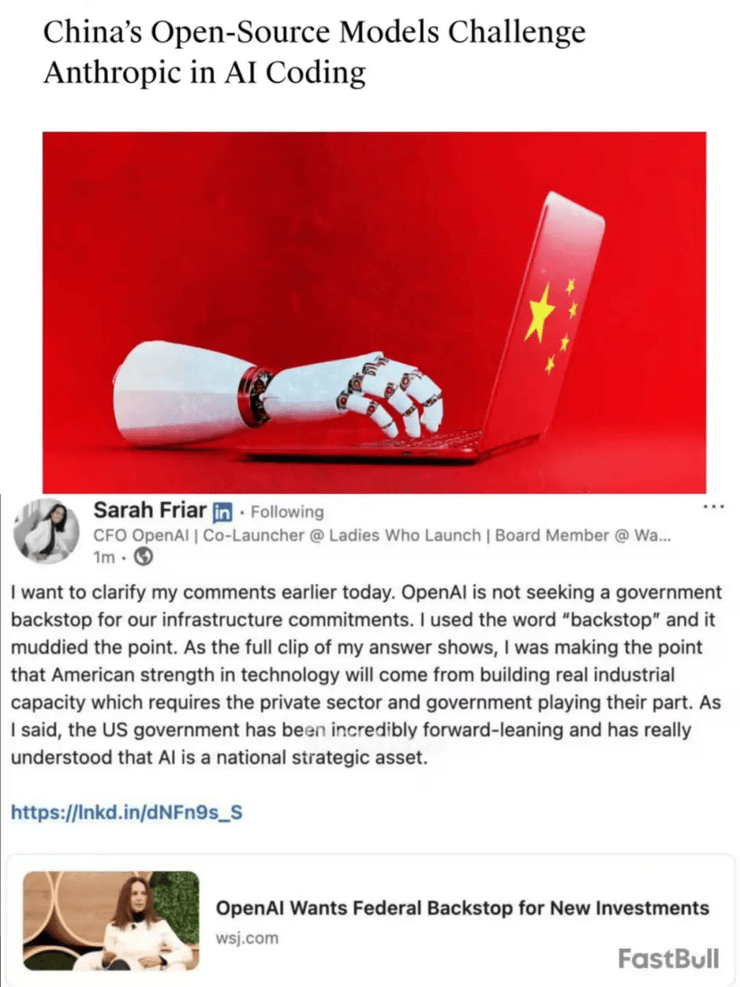 2025 年下半年,中美 AI 圈中的讨论,有两个有趣的现象: 一是,讨论的焦点不再是"中美技术究竟差几代",而是开始认可中国 AI 势力崛起甚至即将迎来反超,比 如以 Airbnb 为代表的海外企业,公开表示大量采用通义千问而不常用 OpenAI;MiniMax开源模型 M2 的 AI Coding 能力超越 Claude,位居 OpenRouter 编程能力前三。 二是,资本的豪赌与泡沫风险都更加剧烈——OpenAI 与英伟达等厂商签下了 1.4 万亿美元算力订单; OpenAI CFO 一句"需要政府为 AI 投资担保"的言论引发了美股科技股大地震,八大科技巨头一周内蒸发 近 8000 亿美元。 不同的是,前者指向市场,说明需求方不再盲目追求智能上限,转而选择成本低、速度快、更具性价比 的中国模型;后者则指向资本,揭示了美国 AI 产业在极高的估值和巨大的资本支出(CAPEX)之间正 面临着一场严峻质疑,投资者对需要持续给创业公司输血的"高举高打"模式,已经开始感到不安和恐 慌。 这两个现象都意味着昔日由美国科技巨头 OpenAI 绝对主导的 AI 叙事开始出现裂痕,我们正站在一个关 键的历史节点:中国 ...