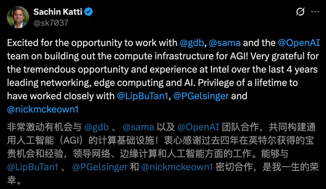 Core Insights - OpenAI has recruited Intel's Chief AI Officer Sachin Katti to enhance its computing infrastructure for AGI research, marking a significant shift in the AI landscape [1][2][4] - Katti's departure from Intel highlights the challenges the company faces in maintaining its AI strategy, as it loses key leadership amid ongoing competition with Nvidia [4][23] Group 1: OpenAI's Strategic Moves - Sachin Katti's expertise will be pivotal in designing and building OpenAI's infrastructure, which is crucial for its ambitious plans to invest approximately $1.4 trillion in AI infrastructure over the next eight years [2][16] - OpenAI is actively expanding its team with high-profile hires from various tech companies to bolster its infrastructure capabilities [18][19] - The company aims to create a vast computing network involving major players like Nvidia, AMD, and Oracle, indicating a strategic approach to enhance its AI capabilities [17] Group 2: Intel's Challenges - Katti's exit leaves Intel's AI strategy in a precarious position, with CEO Chen Liwu stepping in to oversee the AI division amidst a series of leadership changes [4][23] - Intel has faced difficulties in attracting major clients for its foundry business and has struggled to compete with specialized AI chips from competitors like Nvidia and TSMC [31][32] - Despite a strong third-quarter performance with $13.7 billion in revenue, Intel's future in the foundry business remains uncertain, as it lacks a clear strategy to stabilize this segment [33][37]