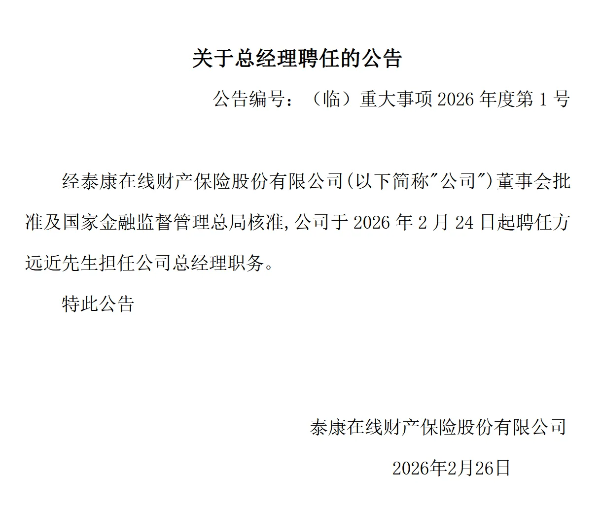 2月26日,泰康在线发布公告称,经泰康在线财产保险股份有限公司董事会批准及国家金融监督管理总局核准,该公司于2026年2月24日起聘任方远近担任公司总经理职务。 (泰康在线) ...