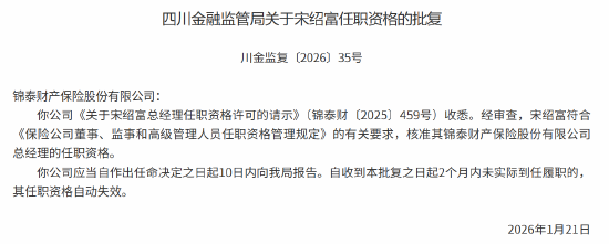 1月27日金融一线消息,四川金融监管局发布批复,核准宋绍富锦泰财产保险股份有限公司总经理的任 职资格。 1月27日金融一线消息,四川金融监管局发布批复,核准宋绍富锦泰财产保险股份有限公司总经理的任 职资格。 据锦泰保险官网高级管理人员简历显示,宋绍富,1972年4月生,博士研究生,正高级经济师。曾就职 于邮电部第五研究所、大唐电信光通信分公司、太平财产保险有限公司;2011年1月至2018年12月历任 锦泰财产保险股份有限公司营业总部总经理、四川分公司总经理、总公司渠道管理部总经理、市场部总 经理、成都分公司总经理等职务;2019年1月至2023年7月任锦泰财产保险股份有限公司副总经理,任职 批准文号为银保监复〔2018〕324号;2020年9月至2023年7月任锦泰财产保险股份有限公司首席信息 官;2021年5月至今任锦泰财产保险股份有限公司首席投资官;2023年7月至今任锦泰财产保险股份有限 公司副总经理(主持工作),任职批准文号为川银保监复〔2023〕186号;2024年11月任锦泰财产保险 股份有限公司党委副书记。 责任编辑:秦艺 据锦泰保险官网高级管理人员简历显示,宋绍富,1972年4月生,博士研究 ...