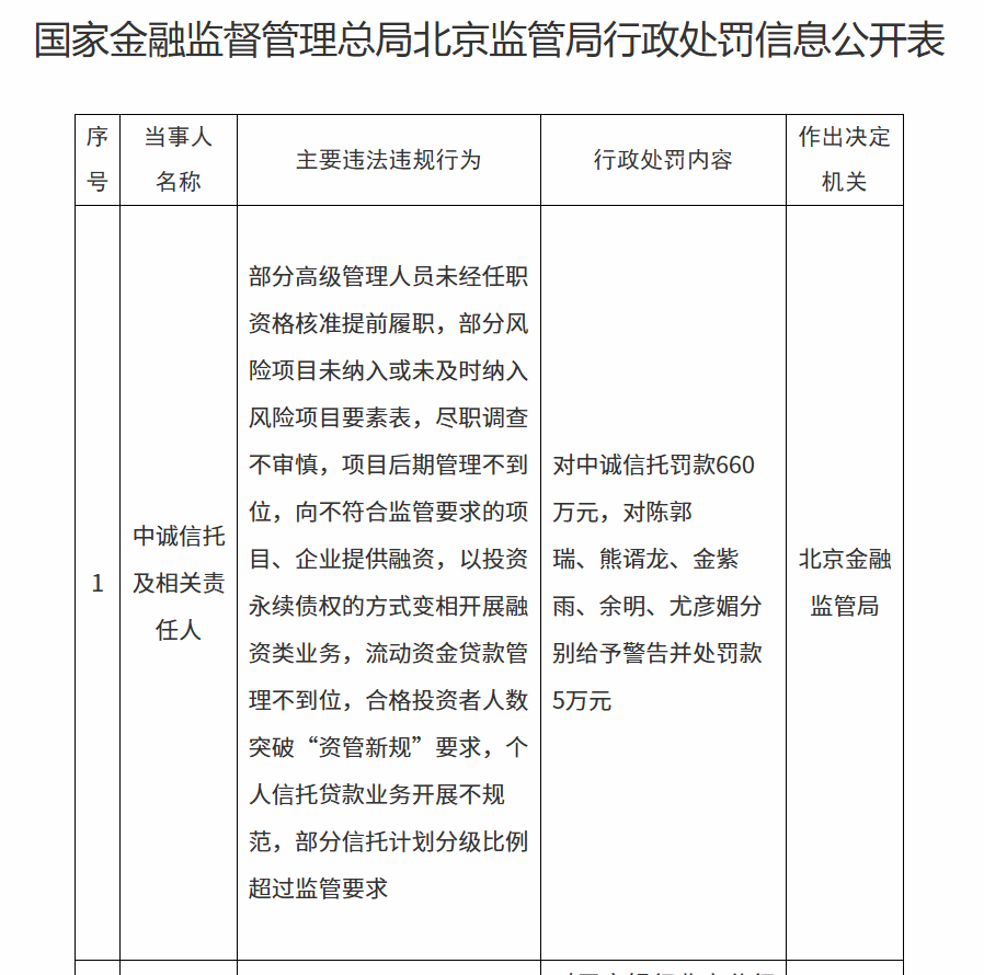 4.项目后期管理不到位; 5.向不符合监管要求的项目、企业提供融资; 6.以投资永续债权的方式变相开展融资类业务; 7.流动资金贷款管理不到位; 8.合格投资者人数突破"资管新规"要求; 凤凰网财经讯 10月17日,据国家金融监督管理总局官网消息显示,中诚信托因变相开展融资类业务等10项违规,被罚款660万 元。 具体违规案由包括: 1.部分高级管理人员未经任职资格核准提前履职; 2.部分风险项目未纳入或未及时纳入风险项目要素表; 3.尽职调查不审慎; 9.个人信托贷款业务开展不规范; 10.部分信托计划分级比例超过监管要求。 相关责任人陈郭瑞、熊谞龙、金紫雨、余明、尤彦媚受到警告,并分别被罚款5万元。 | 序 | 当事人 | 主要违法违规行为 | 行政处罚内容 | 作出决定 | | --- | --- | --- | --- | --- | | 특 | 名称 | 部分高级管理人员未经任职 | | 机关 | | | | 资格核准提前履职,部分风 险项目未纳入或未及时纳入 风险项目要素表,尽职调查 | | | | | | 不审慎,项目后期管理不到 | 对中诚信托罚款660 | | | | 中诚信托 | 位,向不 ...