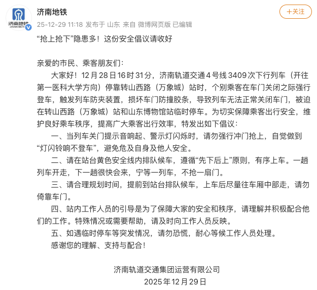 12月29日,济南轨道交通集团运营有限公司发布《安全倡议》,全文如下: 亲爱的市民、乘客朋友们: 大家好!12月28日16时31分,济南轨道交通4号线3409次下行列车(开往第一医科大学方向)停靠转山 西路(万象城)站时,个别乘客在车门关闭之际强行登车,触发列车防夹装置,损坏车门防撞胶条,导 致列车无法正常关闭车门,被迫在转山西路(万象城)站和山东博物馆站临时停车。为切实保障乘客出 行安全,维护良好乘车秩序,提高广大乘客出行效率,特发出如下倡议: 一、当列车关门提示音响起、警示灯闪烁时,请勿强行冲门抢上,自觉做到"灯闪铃响不登车",避免危 及自身及他人安全。 二、请在站台黄色安全线内排队候车,遵循"先下后上"原则,有序上车。一趟列车开走,下一趟很快会 来,宁等一列车,不抢一扇门。 三、请合理规划时间,提前到站台排队候车,上车后尽量往车厢中部走,请勿倚靠车门。 四、站内工作人员的引导是为了保障大家的安全和秩序,请理解并积极配合他们的工作。特殊情况或需 要帮助,请及时向工作人员反映。 五、如遇临时停车等突发情况,请勿恐慌,耐心等候工作人员处理。 感谢您的理解、支持与配合! 济南轨道交通集团运营有限公司 2025年 ...