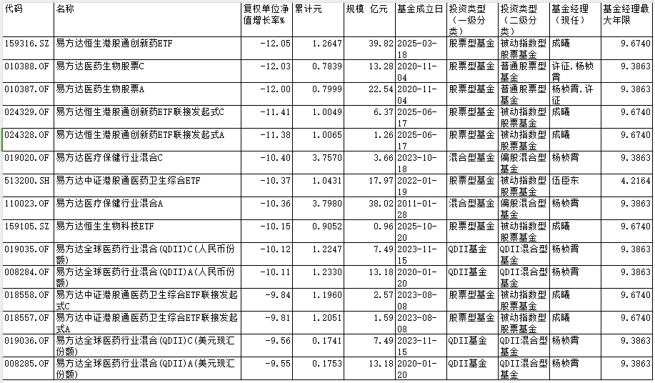 易方达恒生港股通创新药ETF、易方达恒生港股通创新药ETF联接发起式C、易方达恒生港股通创新药ETF联接发起式A、易方 达恒生生物科技ETF、易方达中证港股通医药卫生综合ETF联接发起式C、易方达中证港股通医药卫生综合ETF联接发起式A由基金 经理成曦管理。 易方达医疗保健行业混合C、易方达医疗保健行业混合A、易方达全球医药行业混合(QDII)C(人民币份额)、易方达全球医药行 业混合(QDII)A(人民币份额)、易方达全球医药行业混合(QDII)C(美元现汇份额)、易方达全球医药行业混合(QDII)A(美元现汇份额) 由基金经理杨桢霄管理。 中国经济网北京1月6日讯 根据同花顺数据显示,在2025年12月份有可比业绩的1054只(各份额分开计算,下同)普通股票型 基金中有298只基金净值下跌;全市场8755只有可比业绩的混合型基金中有1897只基金净值下跌;全市场692只有可比业绩的QDII 基金中有453只基金净值下跌。 其中,易方达旗下15只基金跌超8%,分别为易方达恒生港股通创新药ETF、易方达医药生物股票C、易方达医药生物股票A、 易方达恒生港股通创新药ETF联接发起式C、易方达恒生港股通创新药ET ...