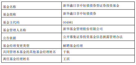 Core Viewpoint - Wang Bin has resigned from multiple bond funds managed by Xinhua Fund Management, indicating a significant change in the management of these investment products [1][2]. Fund Performance Summary - **Xinhua Xinri Enjoy Short-term Bond Fund**: - Established on December 19, 2018, with year-to-date returns of 0.22%, 0.21%, and 0.18% for classes A, B, and C respectively. - Cumulative returns since inception are 21.92%, 15.73%, and 19.41%, with net asset values of 1.2100, 1.1520, and 1.1870 yuan [1][2]. - **Xinhua Fengli Bond Fund**: - Established on October 26, 2016, with year-to-date returns of 1.38% and 1.32% for classes A and C respectively. - Cumulative returns since inception are 41.78% and 36.92%, with net asset values of 1.3982 and 1.3535 yuan [1][2]. - **Xinhua Interest Rate Bond Fund**: - Established on March 18, 2021, with year-to-date returns of 0.35% and 0.29% for classes A and C respectively. - Cumulative returns since inception are 15.63% and 12.32%, with net asset values of 1.1513 and 1.1198 yuan. The E class, established on August 3, 2022, has a year-to-date return of 0.34% and a cumulative return of 100.87%, with a net asset value of 2.0051 yuan [2][4]. - **Xinhua Pure Bond Add Profit Fund**: - Established on December 21, 2012, with year-to-date returns of 0.32%, 0.28%, and 0.25% for classes A, B, and C respectively. - Cumulative returns since inception are 74.28%, 13.81%, and 65.73%, with net asset values of 1.6627, 1.1344, and 1.5950 yuan [2][4]. Management Changes - Wang Bin has been dismissed as the fund manager for multiple funds, including Xinhua Xinri Enjoy Short-term Bond Fund, Xinhua Fengli Bond Fund, Xinhua Interest Rate Bond Fund, and Xinhua Pure Bond Add Profit Fund. Other fund managers will continue to manage these funds [3][4].