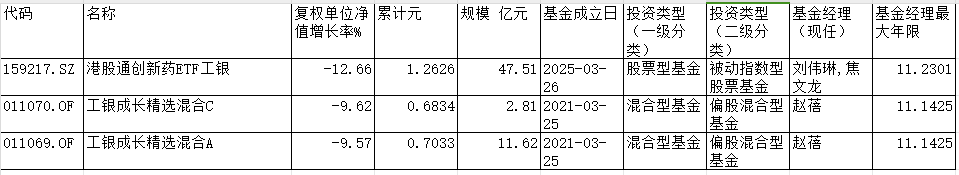 中国经济网北京1月6日讯根据同花顺(300033)数据显示,在2025年12月份有可比业绩的1054只(各份额分开计算,下同)普通股票型基 金中有298只基金净值下跌;全市场8755只有可比业绩的混合型基金中有1897只基金净值下跌。 其中,工银瑞信旗下3只基金跌超8%,分别为工银国证港股通创新药ETF、工银成长精选混合C、工银成长精选混合A,2025年12月的跌 幅分别为12.66%、9.62%、9.57%。 工银国证港股通创新药ETF由基金经理刘伟琳、焦文龙共同管理,工银成长精选混合A/C由基金经理赵蓓管理。截至去年三季度末,工 银国证港股通创新药ETF的规模为47.51亿元,工银成长精选混合A/C的规模为14.44亿元。 | 代码 | 名称 | 复权单位净 累计元 | | 规模 亿元 基金成立日 投资类型 | 投资类型 | 县余经理 | 真舍经理最 | | --- | --- | --- | --- | --- | --- | --- | --- | | | | 值增长率% | | | 一级分 (二级分 | (现任) | 大年限 | | | | | | | 图 대 | | | | 159217. SZ ...