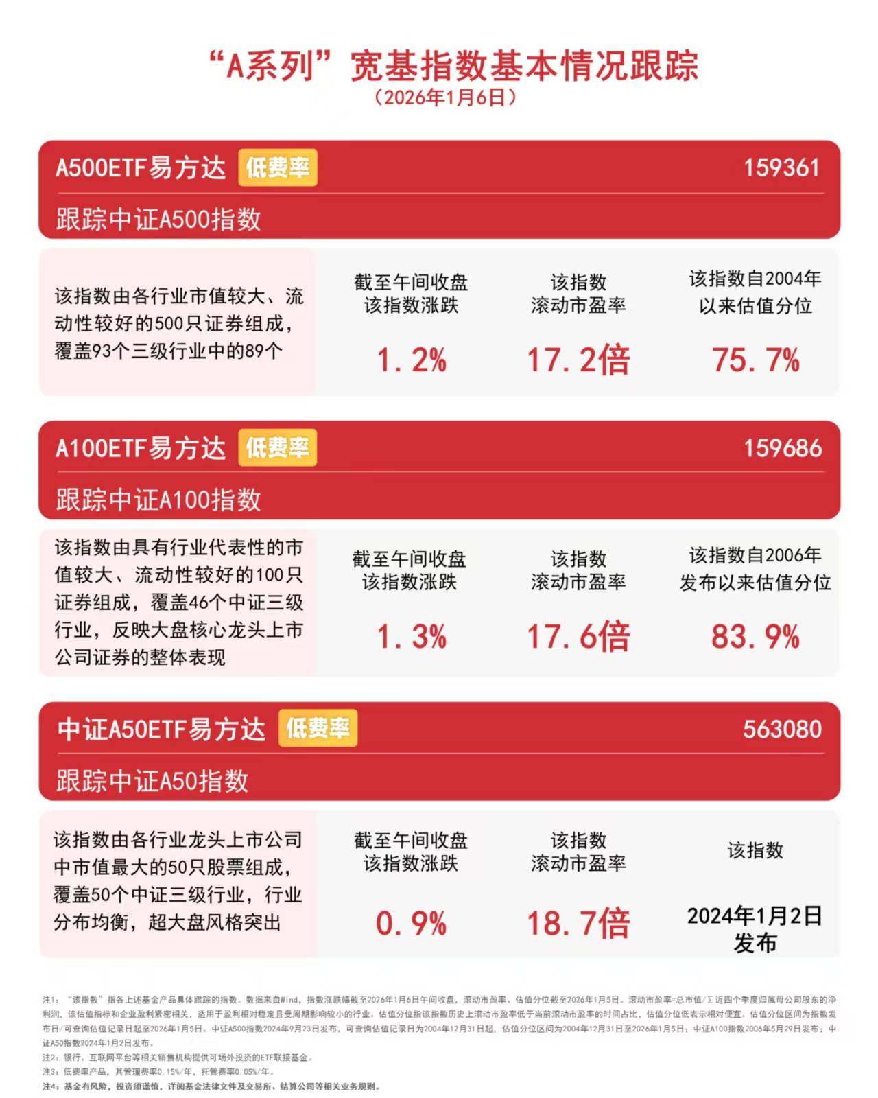 1月6日早盘,大盘震荡上行,沪指昨日收复4000点后今早延续涨势,半日涨超1%,全市场成交额约1.8万亿元,较上日半天放量约1500亿元,超3600只个股 飘红、板块题材上,炒股软件、石油化工、贵金属、保险板块涨幅居前,CPO、光通信、光芯片板块跌幅居前;港股持续上行,有色金属、券商板块走强。 截至午间收盘,中证A.500指数上涨1.2%,沪深300指数上涨1.2%,创业板指数下跌0.04%,上证科创板50成份指数上涨2.0%,恒生中国企业指数上涨1.6%。 核心大盘宽基指数基本情况跟踪 (2026年1月6日) A股大盘宽基:沪深300ETF易方达/A500ETF易方达 (t费率510310 跟踪沪深300指数/中证A500指数 | 沪深300指数由沪深市场中规 | 截至午间收盘 | 该指数 | 该指数 | | --- | --- | --- | --- | | 模大、流动性好的300只股票 | 沪深300指数涨跌 | 滚动市盈率 | 发布以来 | | 组成,完整覆盖11个中证一级 行业 | 1.2% | 14. 3倍 | 67 | | 中证A500指数由各行业市值较 | 截至午间收盘 | 该指数 | 该指数 ...