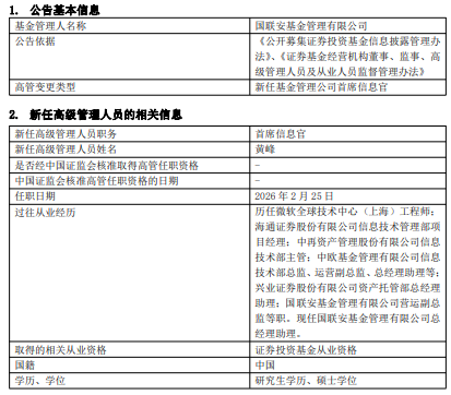 Group 1 - The core announcement is the appointment of Huang Feng as the Chief Information Officer of Guolian An Fund Management Co., Ltd. [1] - Huang Feng has extensive experience in the financial and technology sectors, having held various positions at companies such as Microsoft, Haitong Securities, Zhongzai Asset Management, and others [1][3] - The appointment is in accordance with the regulations set forth by the China Securities Regulatory Commission regarding the disclosure of information for publicly raised securities investment funds [2] Group 2 - Huang Feng's previous roles include positions such as Project Manager at Haitong Securities and Director of Information Technology at China Europe Fund Management [3] - He currently serves as the Assistant General Manager at Guolian An Fund Management Co., Ltd. [3] - Huang Feng holds a master's degree and has obtained the qualification for securities investment fund practice [3]