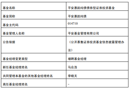中国经济网北京2月27日讯今日,平安基金公告,平安惠韵纯债、平安高等级债、平安惠隆纯债、平安 合瑞定开债、平安合慧定开债增聘马众浩。 马众浩曾任大成基金管理有限公司债券交易员。2018年11月加入平安基金管理有限公司,历任基金运营 部交易室交易经理、固定收益投资中心研究部高级研究员。现担任基金经理。 | 基金名称 | 平安高等级债债券型证券投资基金 | | --- | --- | | 基金简称 | 平安高等级债 | | 基金主代码 | 006097 | | 基金管理人名称 | 平安基金管理有限公司 | | 公告依据 | 《公开募集证券投资基金信息披露管理办 | | | 法》 | | 基金经理变更类型 | 增聘基金经理 | | 新任基金经理姓名 | 马众浩 | | 共同管理本基金的其他基金经理姓名 | 李晓天 | | 高任基金经理姓名 | - | | 基金名称 | 平安惠隆纯债债券型证券投资基金 | | --- | --- | | 基金简称 | 平安惠隆纯债 | | 基金主代码 | 003486 | | 基金管理人名称 | 平安基金管理有限公司 | | 公告依据 | 《公开募集证券投资基金信息披露管理办 | | ...