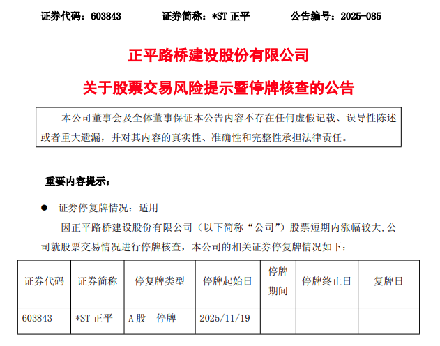 18日晚间,*ST正平(603843)公告称,公司股票自2025年9月1日至11月18日累计涨幅达221.93%,股价短期涨幅与同期上证指数、建筑行业存在严重偏 离,已严重脱离基本面。公司股票自2025年11月19日(星期三)开市起停牌核查,自披露核查公告后复牌,预计停牌时间不超过10个交易日。 值得注意的是,自11月12日复牌起,5个交易日内,*ST正平已连收5个涨停板。而就在17日,公司发布了风险提示公告(详见4连涨停,603843再次提示 风险!)。 | *STIEF® | | | | | | --- | --- | --- | --- | --- | | 603843 L1 - | | | | | | 关于"*ST正平(603843)"的风险提示 | | | | | | 今开 8.47 最高 8.26 8.66 | | 8.66 | 最低 | | | 换手 9.98% 总手 69.83万 金额 4.97% 041 | | | | 6.00亿 | | 总值 60.59亿 流值 60.59亿 市盈和0-45.55 | | | | 曲家 | | ◀ 停复牌:自2025-11-19 连续停牌,停牌原因:交易异 ...