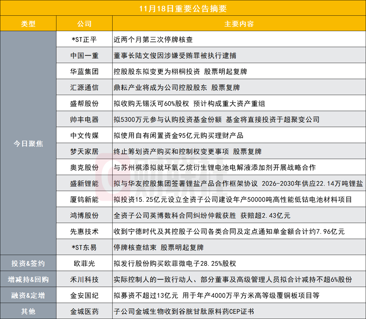 登录新浪财经APP 搜索【信披】查看更多考评等级 | | | 11月18日重要公告摘要 | | --- | --- | --- | | 类型 | 公司 *ST正平 | 主要内容 近两个月第三次停牌核查 | | | 中国一重 华蓝集团 汇源通信 | 董事长陆文俊因涉嫌受贿罪被执行逮捕 控股股东拟变更为栩桐投资 股票明起复牌 鼎耘产业将成为公司控股股东 股票复牌 | | | 盛帮股份 | 拟收购无锡沃可60%股权 预计构成重大资产重组 | | | 帅丰电器 | 拟5300万元参与认购投资基金份额 基金将直接投资于超聚变公司 | | | 中文传媒 | 拟使用自有闲置资金95亿元购买理财产品 | | 今日聚焦 | 梦天家居 | 终止筹划资产购买和控制权变更事项 股票复牌 | | | 奥克股份 | 与苏州祺添拟就环氧乙烷衍生锂电池电解液添加剂开展战略合作 | | | 盛新锂能 | 拟与华友控股集团签署锂盐产品合作框架协议 2026-2030年供应22. 1 | | | 厦钨新能 | 拟投资15. 25亿元设立全资子公司建设年产50000吨高性能低钻电池材 | | | 鸿博股份 | 全资子公司英博数科合同纠纷仲裁获胜 获 ...