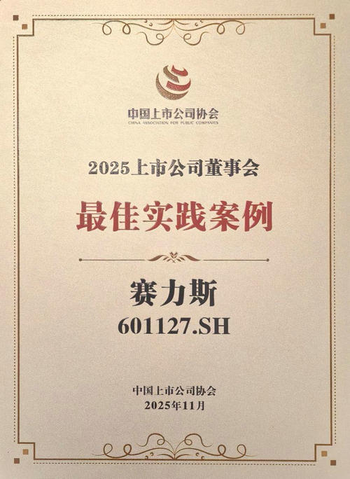 据介绍,本次"上市公司董事会最佳实践案例"由中国上市公司协会组织开展,旨在促进上市公司董事会 合规有效运作、提升上市公司治理效能、发挥优秀公司示范引领作用。赛力斯获得此次活动的最高等级 荣誉——最佳实践案例,不仅是监管机构与资本市场对公司治理水平的高度认可,更是对其以治理赋能 高质量发展、以价值共享回馈各方信任的充分肯定。 作为一家技术科技型企业,赛力斯始终坚持以技术创新为核心驱动力,持续深耕新能源汽车领域。2025 年前三季度实现营业收入1105.34亿元,归属于上市公司股东的净利润53.12亿元,同比增长31.56%。今 年1—10月,赛力斯新能源汽车累计销量达356085辆。 值得一提的是,11月5日赛力斯成功在港交所主板上市,成为首家"A+H"两地上市的豪华新能源车企, 为公司注入强劲的国际资本动能,将进一步助力其加速技术创新、深化全球布局,全面提升产品的全球 竞争力与品牌影响力。(郑渝川) 11月18日,中国上市公司协会发布了"2025上市公司董事会最佳实践案例"评选结果。凭借科学完善的治 理机制、规范高效的董事会运作及创新实践,赛力斯(601127)成功获选"2025上市公司董事会最佳实 践案例" ...