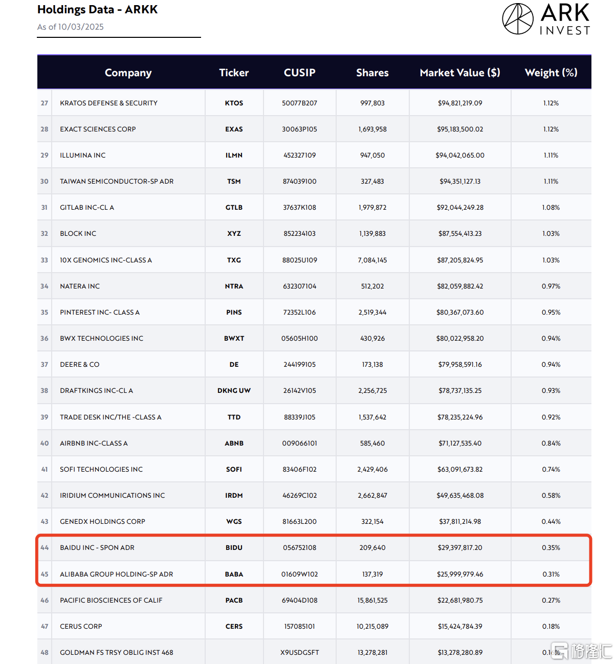 Group 1 - Cathie Wood's Ark Invest has significantly increased its holdings in Alibaba and Baidu stocks over three consecutive days, reflecting a renewed focus on Chinese tech stocks [1][2] - On September 30, Ark Invest purchased $4.1 million worth of Alibaba shares, followed by $5.5 million on October 1, and approximately $2.74 million on October 2 [1] - For Baidu, Ark Invest bought $6.9 million on September 30, $2.97 million on October 1, and around $6.4 million on October 2 [1] Group 2 - As of October 3, Ark Invest's market value for Baidu holdings reached $29.4 million, accounting for 0.35% of the ETF, while Alibaba's holdings were valued at $26 million, representing 0.31% [3] - The recent buying activity coincides with a rebound in foreign capital inflows into the Chinese stock market, which reached $4.6 billion, indicating a positive sentiment towards Chinese assets [5] Group 3 - The buying spree by Ark Invest is seen as a confidence booster for the Chinese concept stocks market, especially amid signs of stabilization in the Chinese economy and new growth points in the tech sector [4]